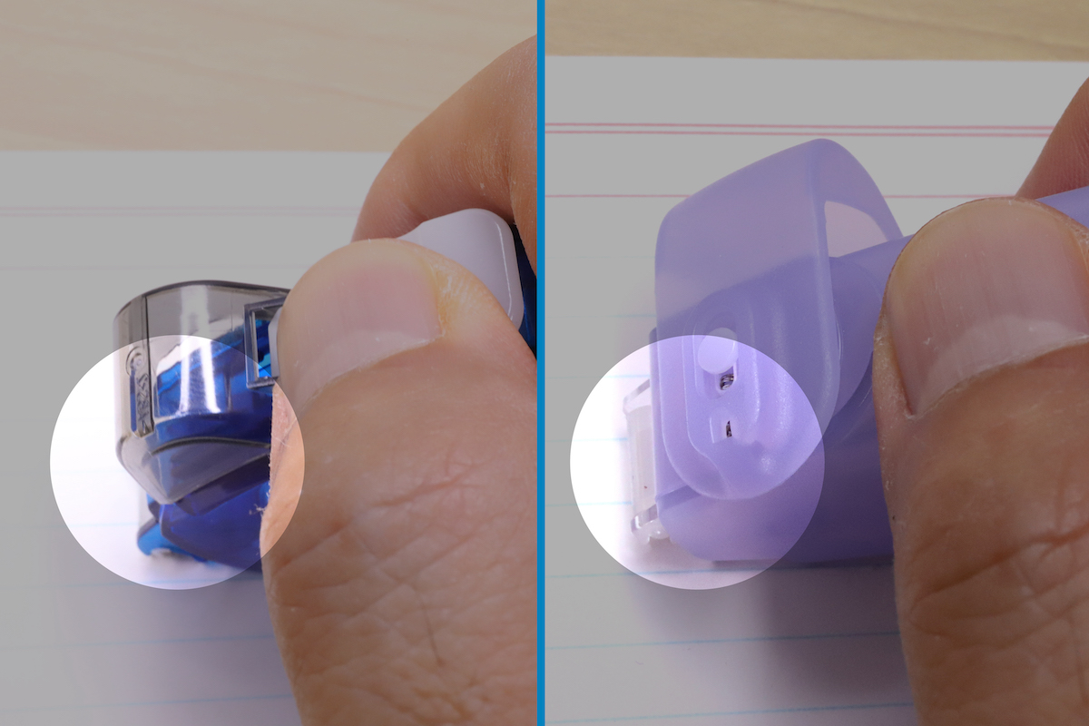 テープのりは、粘着剤に埃やゴミが付着すると使いものにならない。だから携帯時にゴミが付かないように、普段はヘッド周りをキャップでカバーする必要がある。