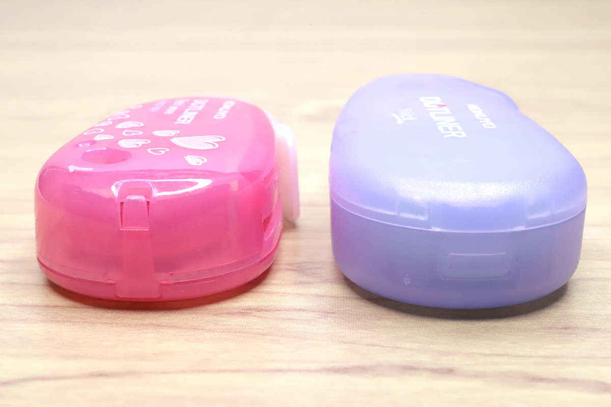 同シリーズの使い切り最小「ドットライナープチモア」と比べると、全長はさすがに10mm以上大きいが、幅・厚みはほぼ変わらない。特に厚みはペンケースへの収納しやすさに関わる部分なので、これが変わらないのは優秀だと思う。つめ替えタイプとしては、まず間違いなく業界最小クラスと言えるだろう。