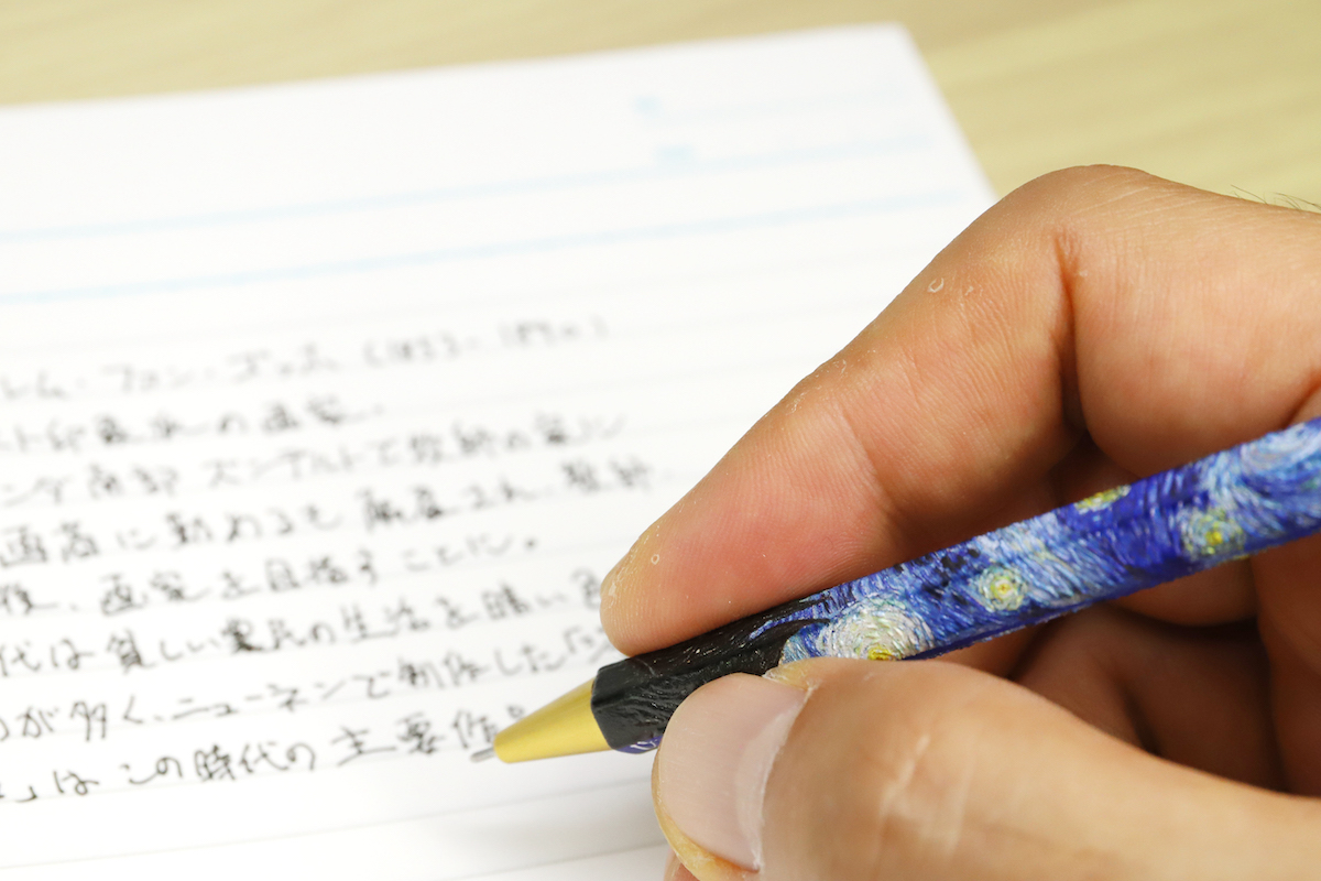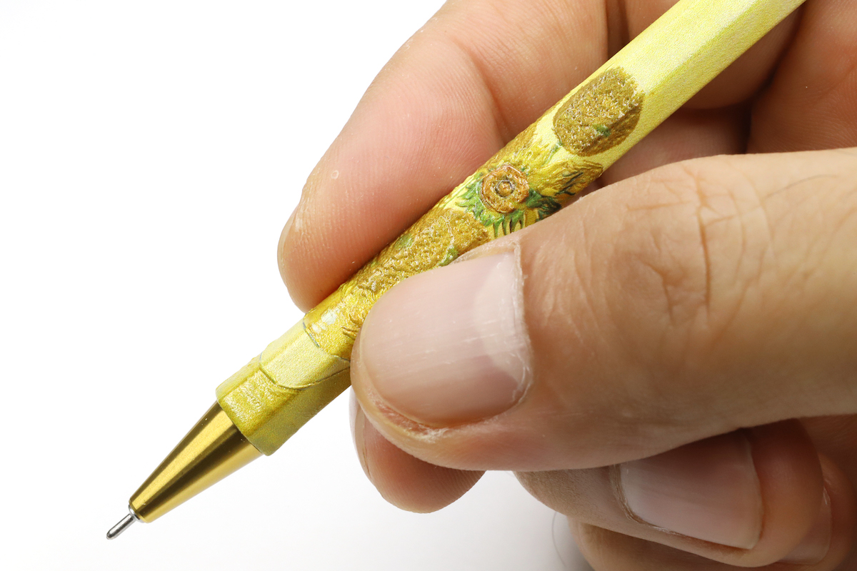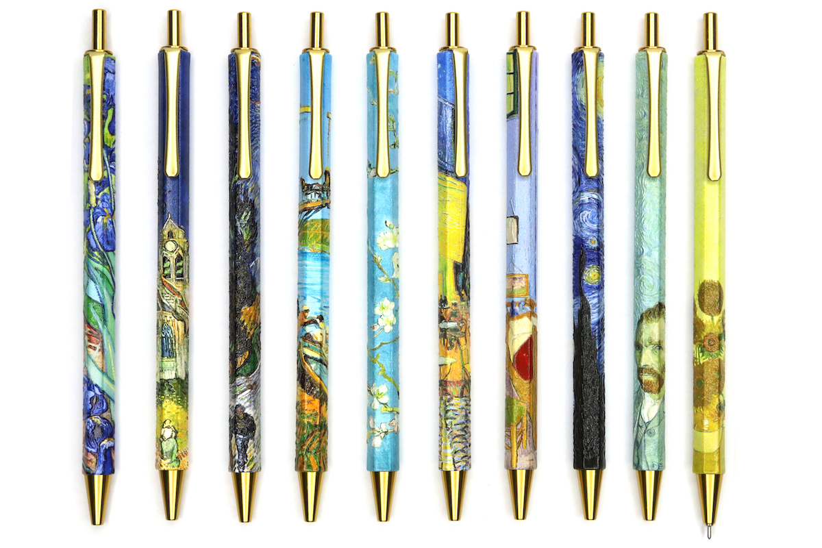 ペノンの「タッチミー! アートペン ゴッホ」シリーズは、お馴染みの「ひまわり」や「星月夜」といったゴッホの名画を、六角の木軸にプリントしたボールペン。