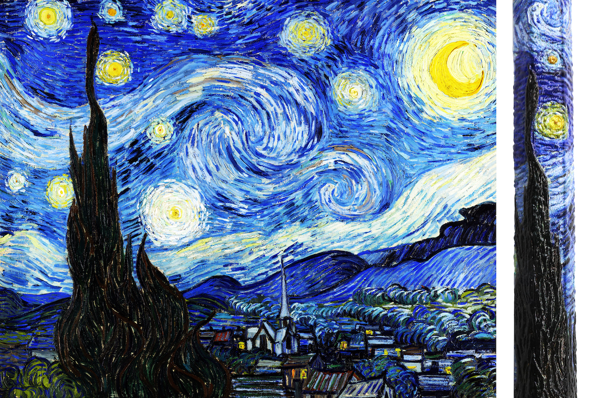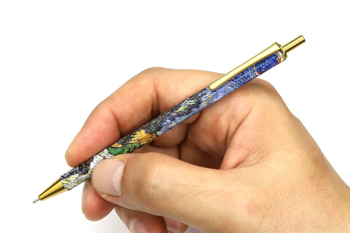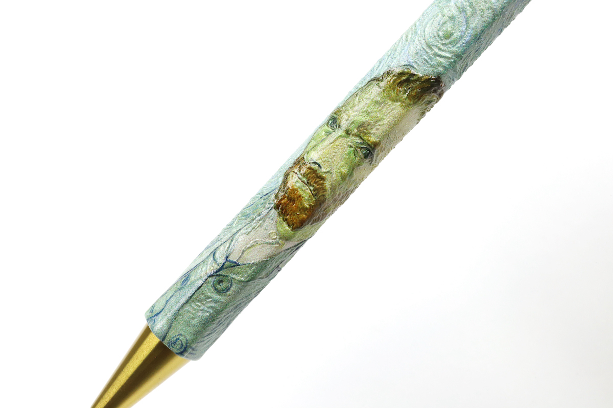木軸に施された立体印刷は、ゴッホのあの鮮烈なタッチを再現したかのようで、印刷や写真ではなく、本物の油彩の質感そのものだ。正直、ペン軸に名画が印刷されたものは従来、ミュージアムグッズとしてさまざま発売されてきたが、この立体印刷は迫力のケタが違う。