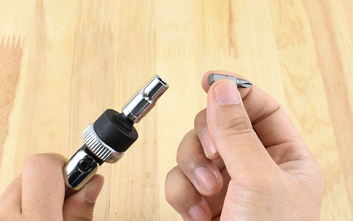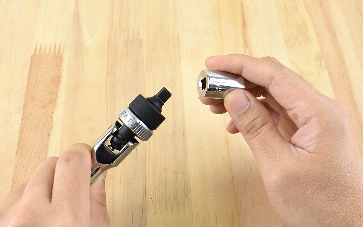 使い方ですが、ソケットの場合はそのままラチェットハンドルにはめるだけ。6.35mmの差込角にしっかりとはまり、作業の途中で抜けてしまう心配もありません。