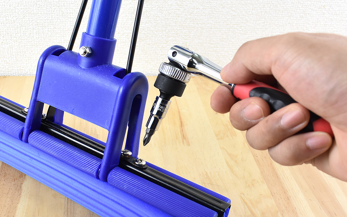 ラチェットハンドルの回転方向は、装着部分のすぐ下にある切り替え部分を回すことで変更できます。切り替え部分を右に回すと装着部分の右回りができなくなるので、ネジを緩めるときは切り替え部分を右に回してください。一方ネジを締めたいときは、切り替え部分を左に回します。