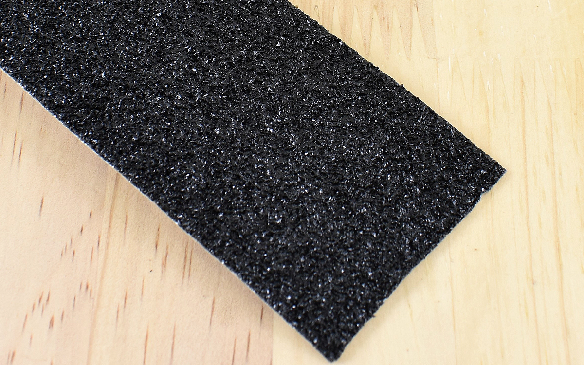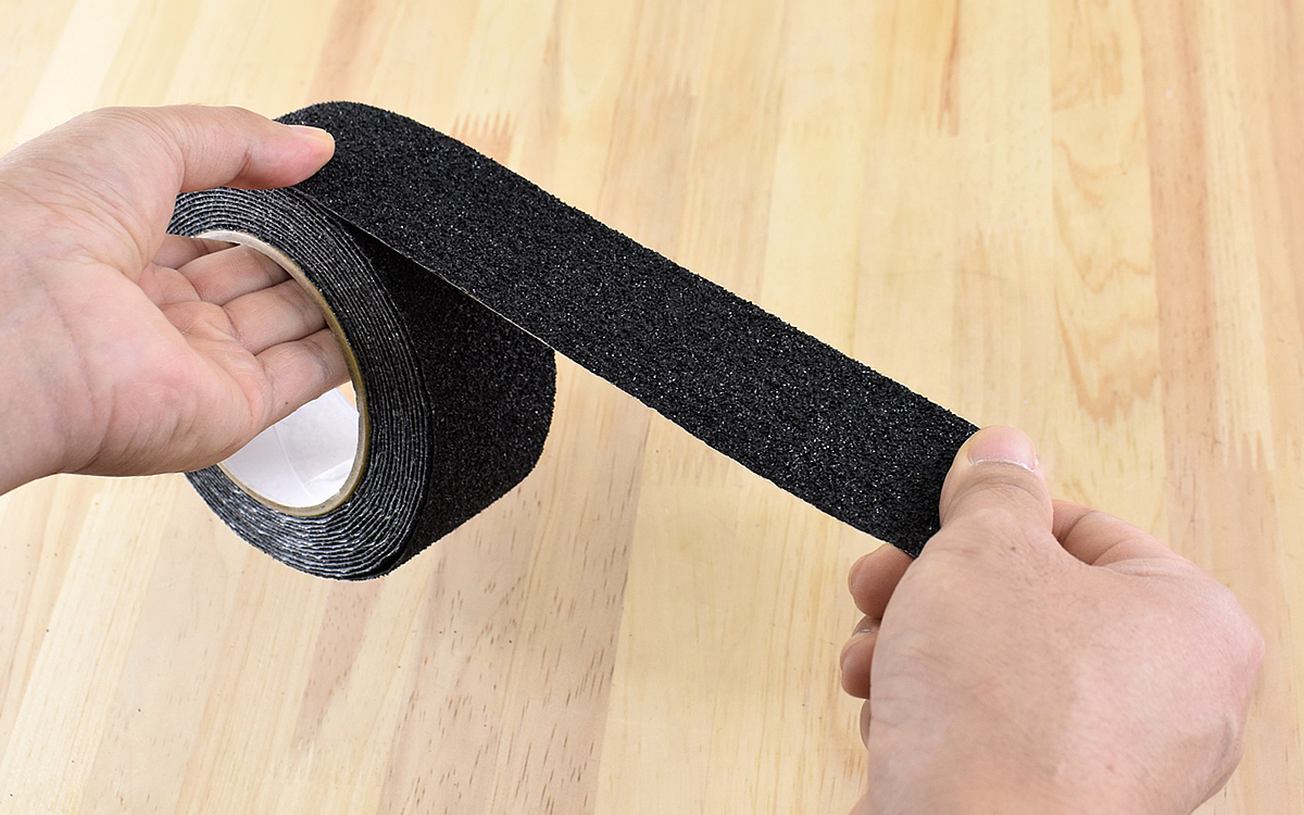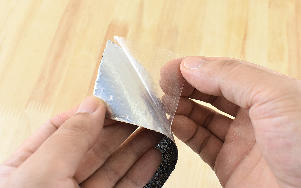 テープの表面はかなりざらついており、紙やすりのような触り心地。強く押さえたりこすったりすると多少指に痛みがあるので、滑り止めとしての効果は抜群です。試しにテープの上で足を滑らせてみましたが、靴下がガッツリ噛み合ってほぼ滑ることはなさそうでした。テープの裏地はアルミ素材で、凹凸のある場所にもしっかり粘着するので用途の幅が広がりますね。