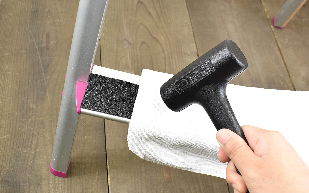 貼り付ける時は、このようにプラスチックハンマーなどで叩くとよりしっかりと密着させられます。手でも簡単に貼れますが、空気や水の隙間の侵入を防ぐためにこの作業をおこなうだけで使用寿命を延ばせますよ。