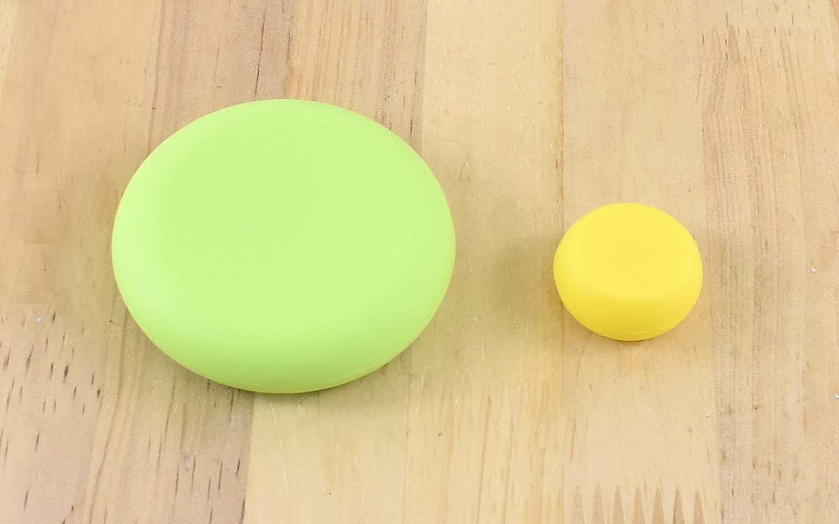 商品のサイズは、大キャップが約7(直径)×1.8cm(高さ)、小キャップが約3(直径)×1.5cm(高さ)です。素材はシリコーンゴム製で伸縮性があり、非常に軽いのが特徴。パステルカラーのような優しい色合いで、マークやロゴなどが無くシンプルなのにどこか可愛さもあります。