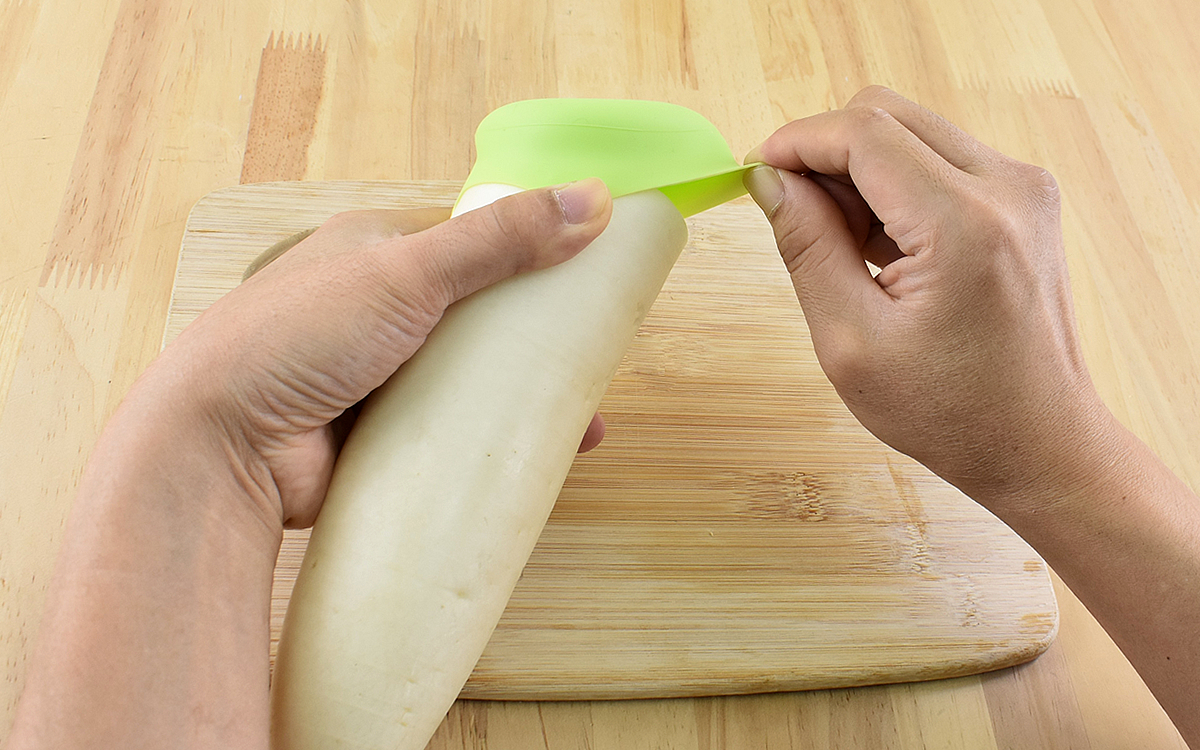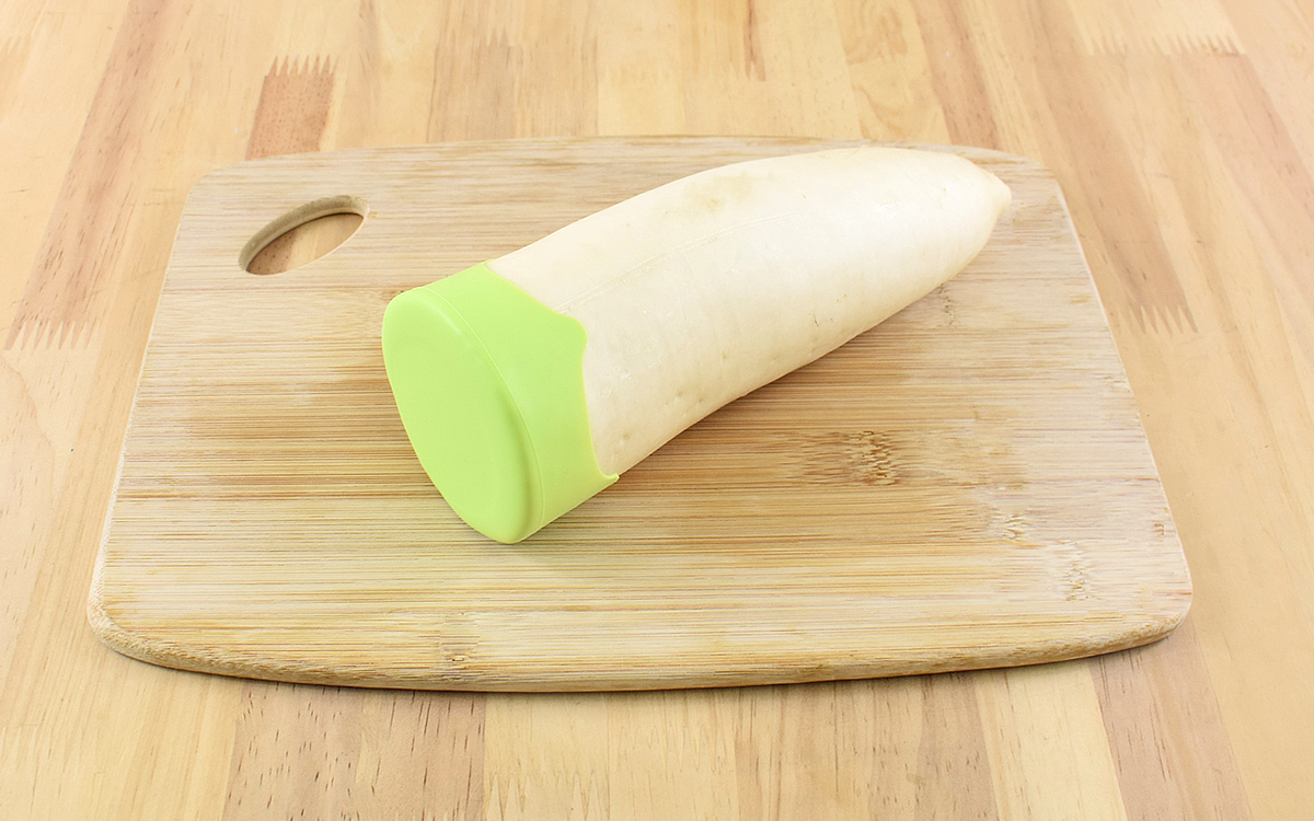 実際に切った大根に被せてみましょう。片側を被せて引っ張りながら付けてみると、ぴったりとフィットしました。切り口が大きい野菜だと多少コツが要るかもしれませんが、慣れてしまえば簡単。空気が入る隙間もないので乾燥を防いでくれそうです。