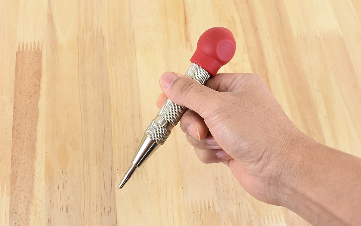 従来のポンチはハンマーを使って打ち込む必要がありますが、同商品はなんといっても片手で扱えるのが大きな魅力。実際に厚みのある板を用意して頭をグっと押さえつけたところ、芯部分がグリップ側に向かって収まりきった瞬間「バチン!」という衝撃とともにマーキングすることができました。