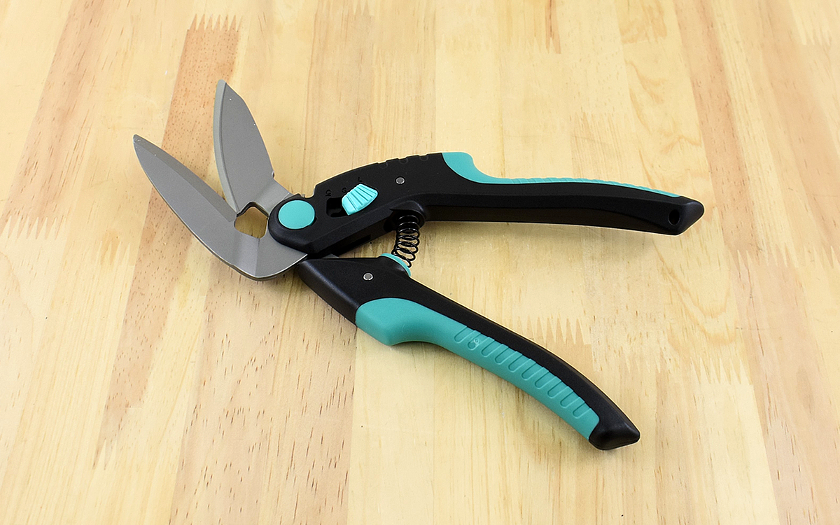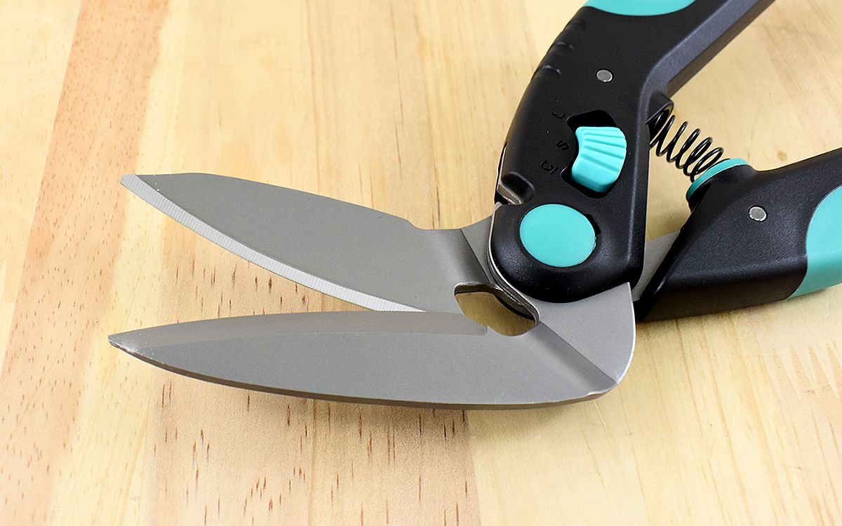 全長は250mmほどで、パっと見た印象は従来の万能はさみと変わらないデザインです。刃はステンレス鋼でできており、重量は約265g。手にしてみると、特に刃側にずしりとした重さがありました。刃のつくりがしっかりしている印象で、切断力の強さを感じます。