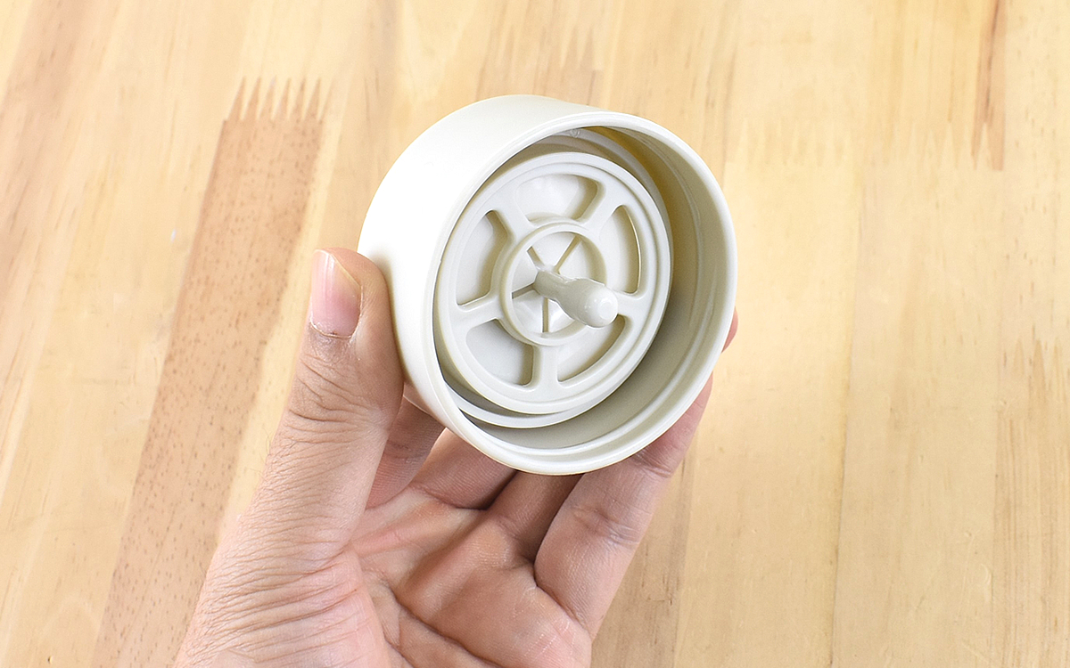 360度全てが注ぎ口になっている蓋の部分ですが、なぜ傾けた方向の蓋が開くのか詳しく見ていきましょう。注ぐ状態を確認すると、傾けたときに中身が蓋を押し上げて蓋に隙間が。また中心の突起がストッパーになり、蓋が開きすぎることもありません。