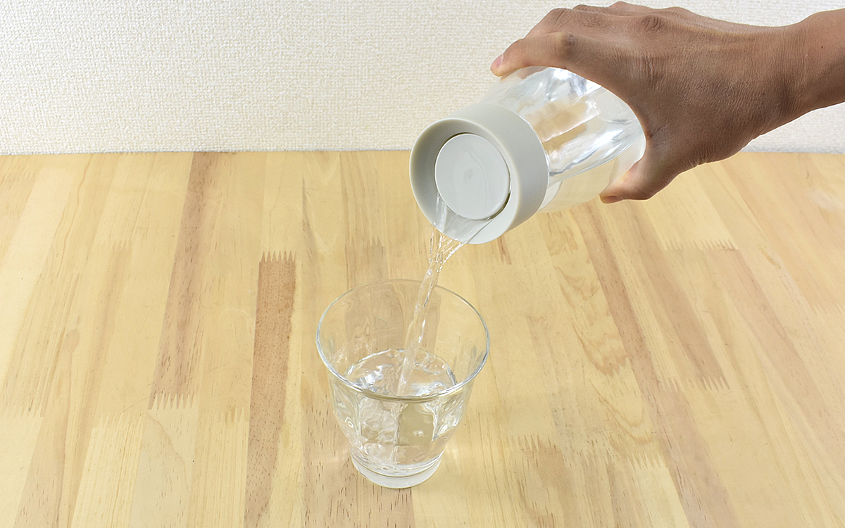 実際にボトルに水を入れて注いでみると、傾けた方向の水によって蓋が押し上げられて開き、スムーズにグラスに水を注ぐことができました。ボトルを持ってから注ぎ終わるまで蓋に触れることもなく、手の位置も変える必要がないのでとても楽ちん。