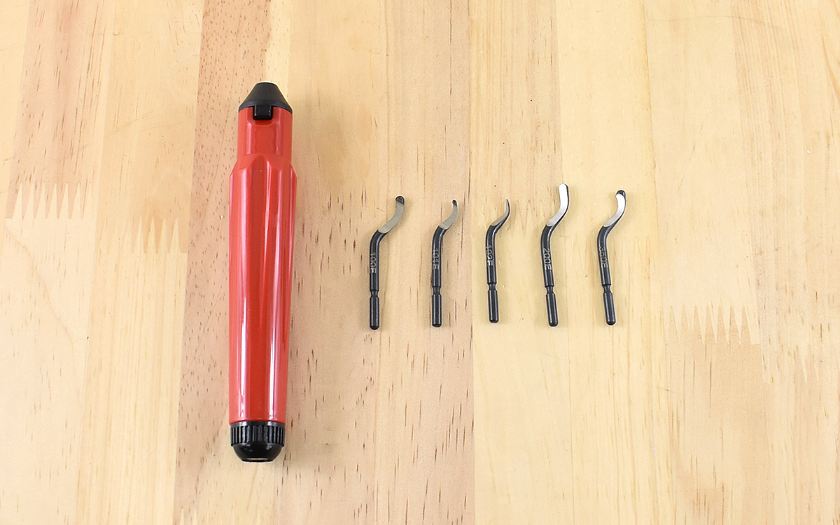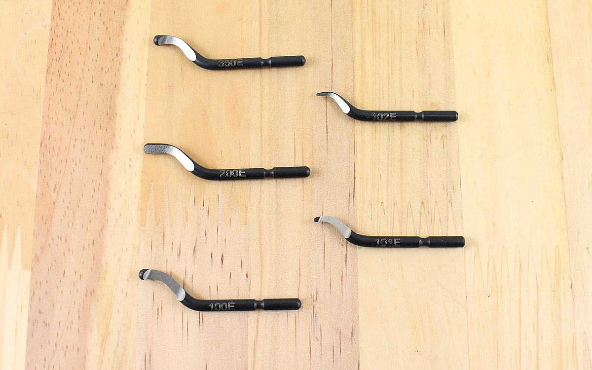 ブレードはそれぞれ形状が異なり、加工内容によって交換する形となっています。100Eは鉄・アルミ用で、200Eは真鍮・鋳鉄用と異なる材質をカバーできるのも特徴の一つ。350Eは各材質の端面用のほか、101EはΦ2.8以下の小径穴用、102Eは真鍮・鋳鉄の小穴用と、作業しづらい小さな穴にも対応できます。