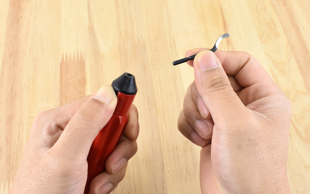 ブレードの取り付け方はとてもシンプル。本体先端にあるボタンを押しながら、ブレードを装着すると固定されます。「これだけ?」と思うほど簡単に取り付けることができました。