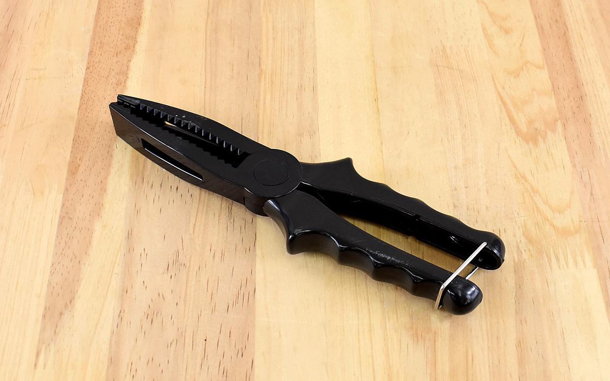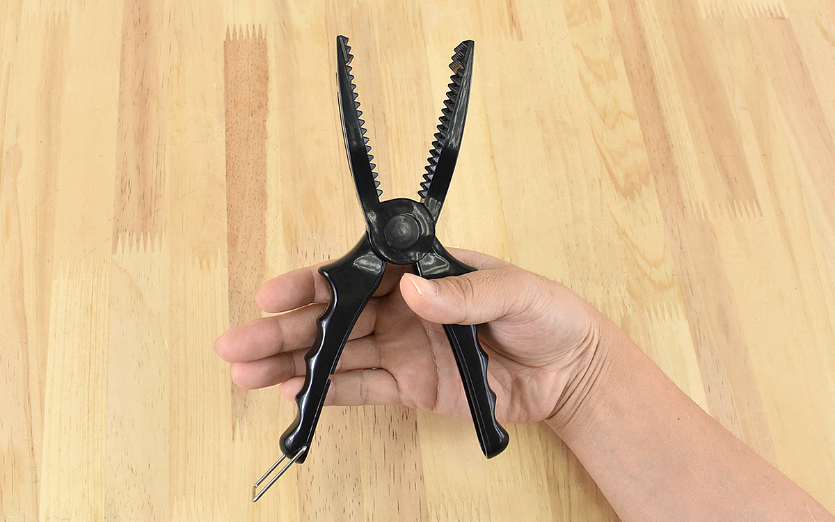 ABS樹脂でできた魚つかみは、持ち手と先端の間に交点があってペンチと似た見た目。大きさは約6(幅)×2(高さ)×20.5cm(長さ)ほどで、持ち手の先端に付いたストッパーを使えばつかみを閉じた状態で収納可能です。釣りに行く時は何かと必要な道具が多いので、コンパクトに持ち運べるのは嬉しいですね。