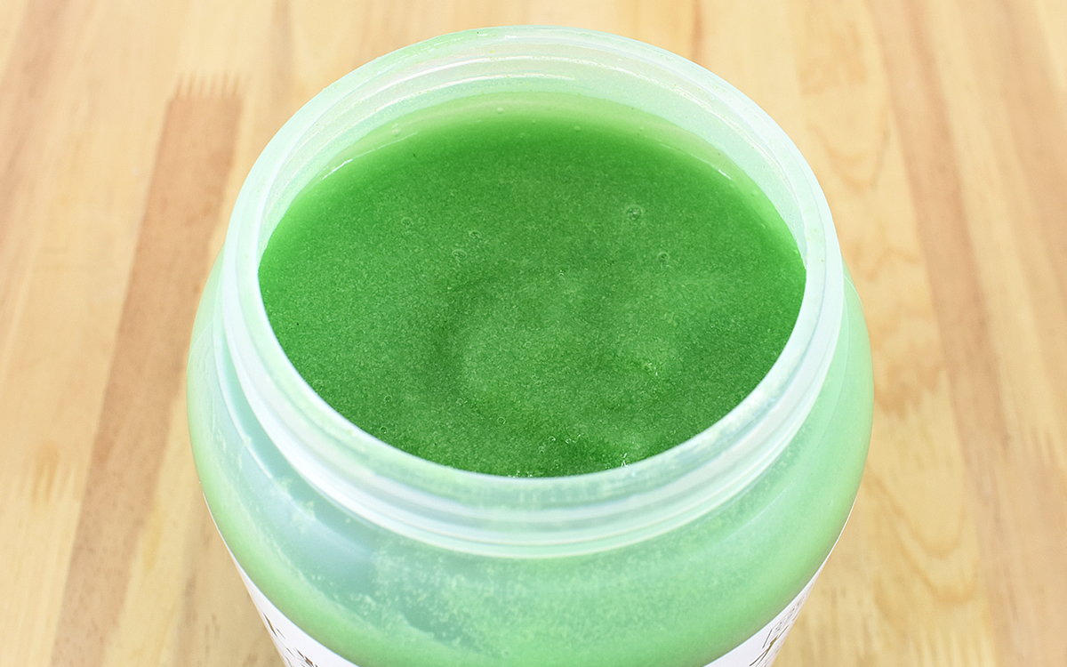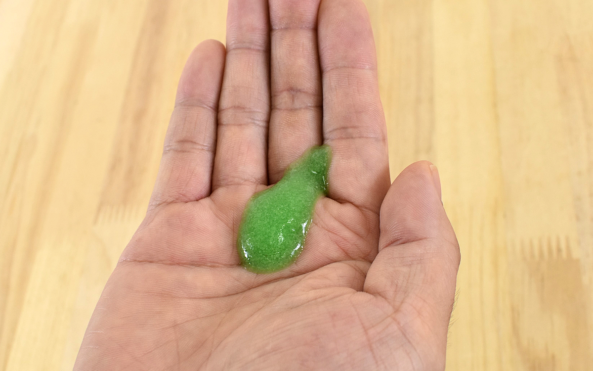 手元に届いたアイテムを見て、家庭用手洗い洗剤の倍はありそうなボトルサイズにびっくり。1.4kgもの内容量を誇りながら1309円で購入できるため、かなりお得と言えるのではないでしょうか。ちなみに洗剤自体はきれいな緑色をしていて、画像をご覧のとおりトロっとした質感。スクラブの細かい粒も目立ちます。