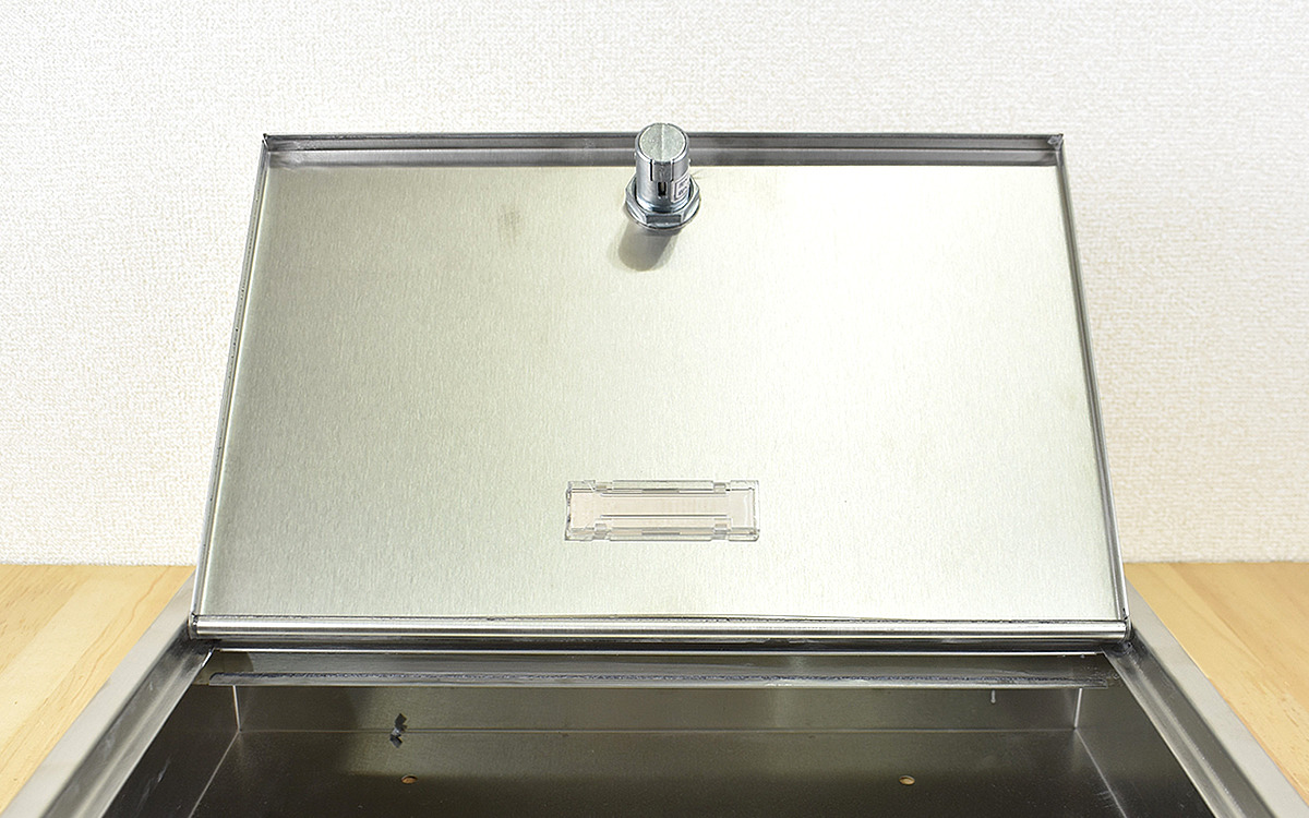 ステンレス(SUS304)製だけに頑丈かつ洗練されたデザインが目を引く同商品。名札は取り出し口の裏側から入れられるようになっていますが、あまりサイズが大きくないため社名・個人名をプリントしたシールを貼るのも1つの方法です。