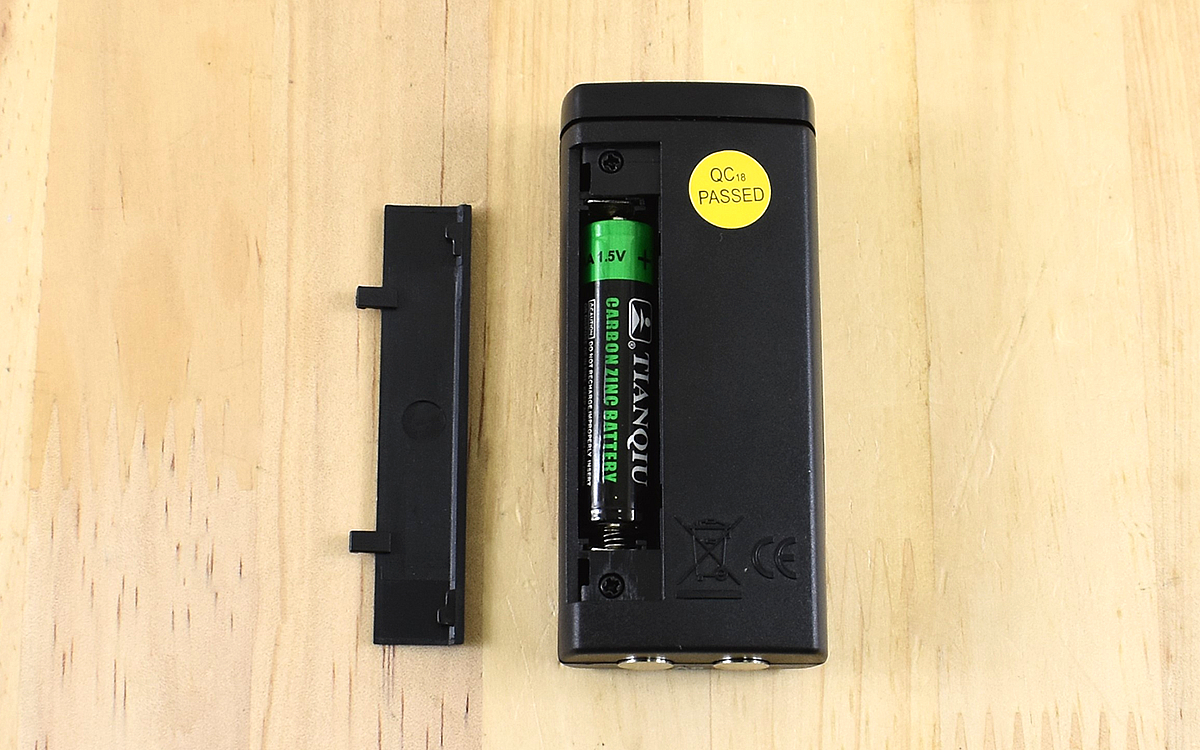 手元に届いたアイテムは手のひらに余裕で収まる大きさ。80(高さ)×35(幅)×18mm(奥行)とコンパクトなので、保管時にかさばる心配はありません。使用する電池も単4形乾電池1本で済み、設定ボタンなどもないのですぐに使い始めることができます。