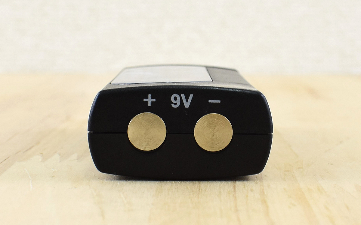 実際に電池チェッカーを使用したところが下の画像。液晶の左右に1.5Vタイプと9Vタイプの目盛りが割り振られていて、電池の向きを確かめながら設置した瞬間にゲージが上昇して一目で電池残量が判別できました。なお9Vタイプは本体底のテストターミナルを使用するので間違えないようにしましょう。