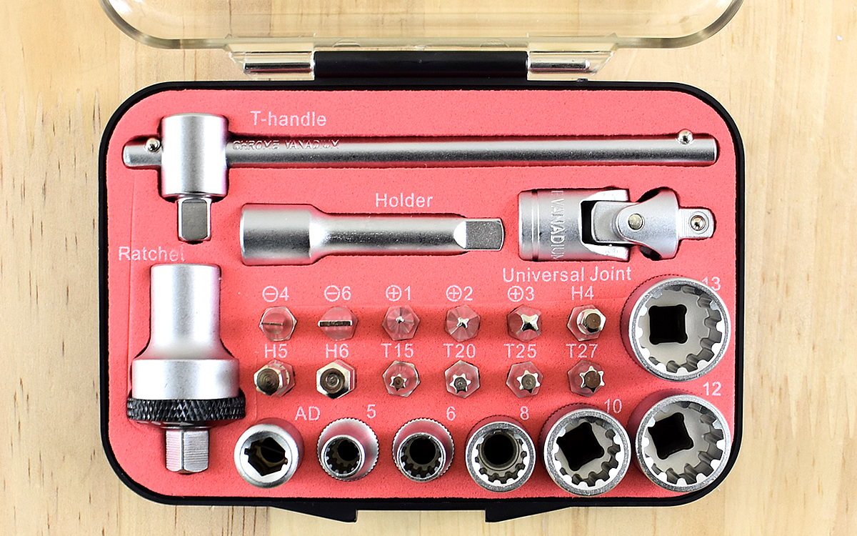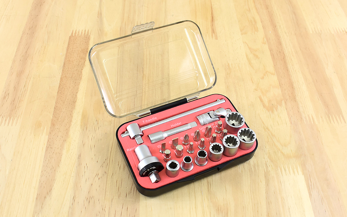 ケースの中身を見ると、パーツの収納場所が一目でわかるよう緩衝材に名称やサイズの表記が。ケースは小さくても、T型スライドハンドルやラチェットアダプターなど“あると便利”なパーツをまとめているのがGOODです。ビットもこれだけ豊富に揃っていれば、自宅でおこなうDIYの大半をカバーできるのではないでしょうか。