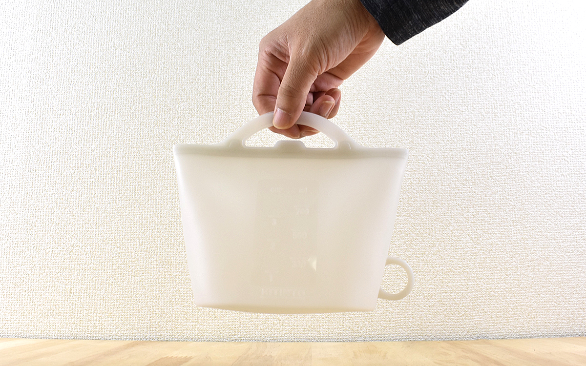 シリコーンゴム製なので気持ち良い柔らかさですが、きちんと自立することができます。冷凍庫の中や調理時も立てて使用可能なので、これなら使いやすいですね。ジップ部分はパチッとはめると、口の縁が直線状にピタっと閉じてくれるので開閉も簡単。ただし完全密封ではないので、液体類の保管や持ち運びの際には注意が必要です。