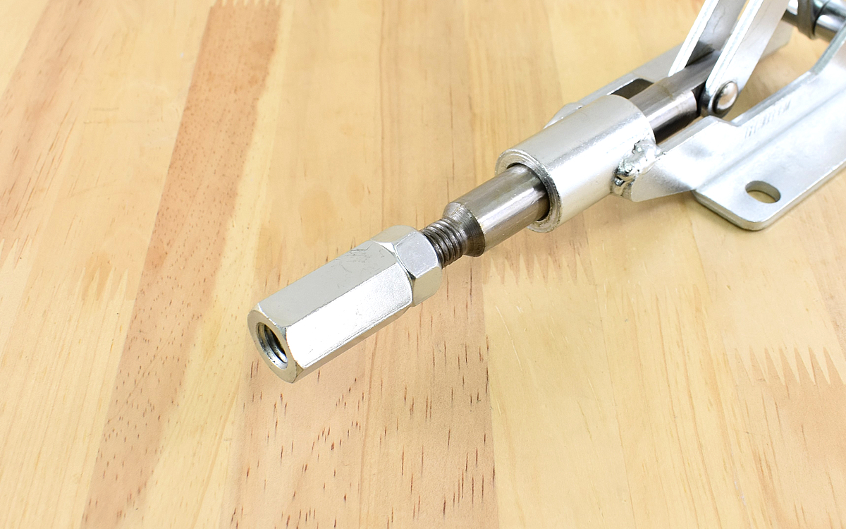 押圧力454kgを誇るパワーはもちろん、「これはありがたい」と感じたのがアームに付属したシャフトでストローク調整が可能な点です。対象を押さえる際に微調整が効き、なおかつナットでシャフト自体を固定することもできました。