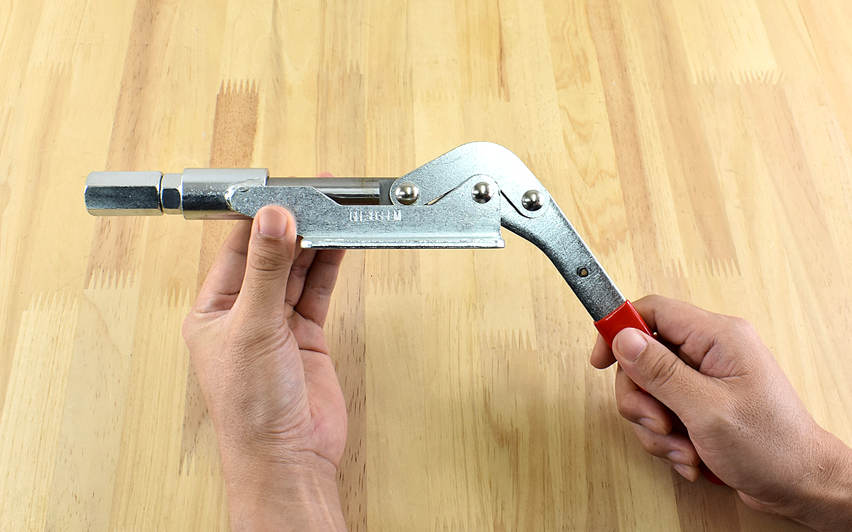 手元に届いたのは、裁断機やジャッキのように大きなハンドルが印象的なアイテム。本体にはSS400(ユニクローム)が使用されていて、手にするとずしりとした重さを感じます。ちなみに今回選んだ商品は、ストロークの長さが50mmのもの。他にも12mm・30mmタイプがあり、構造・押圧力・価格も異なるため使用状況に応じたアイテムを選びましょう。