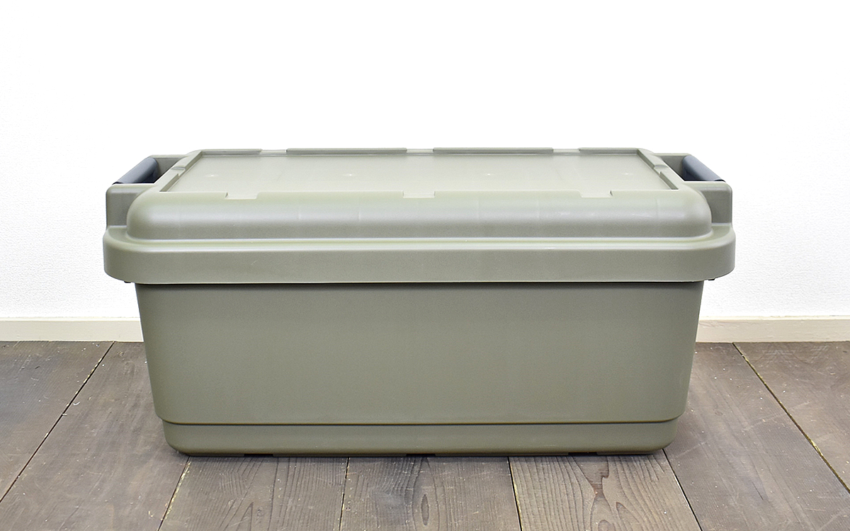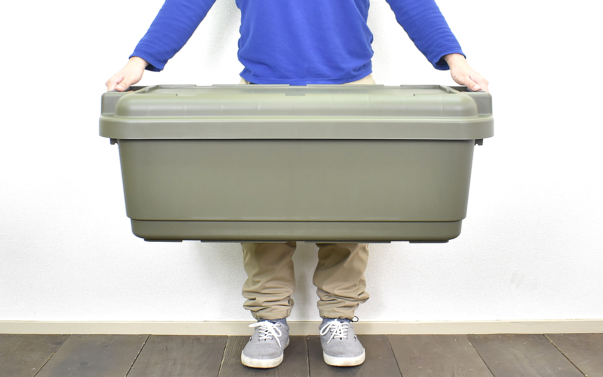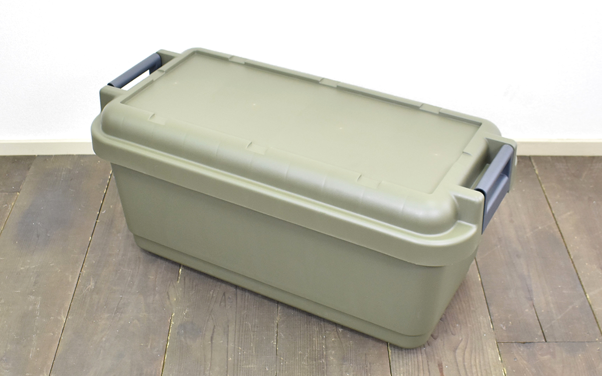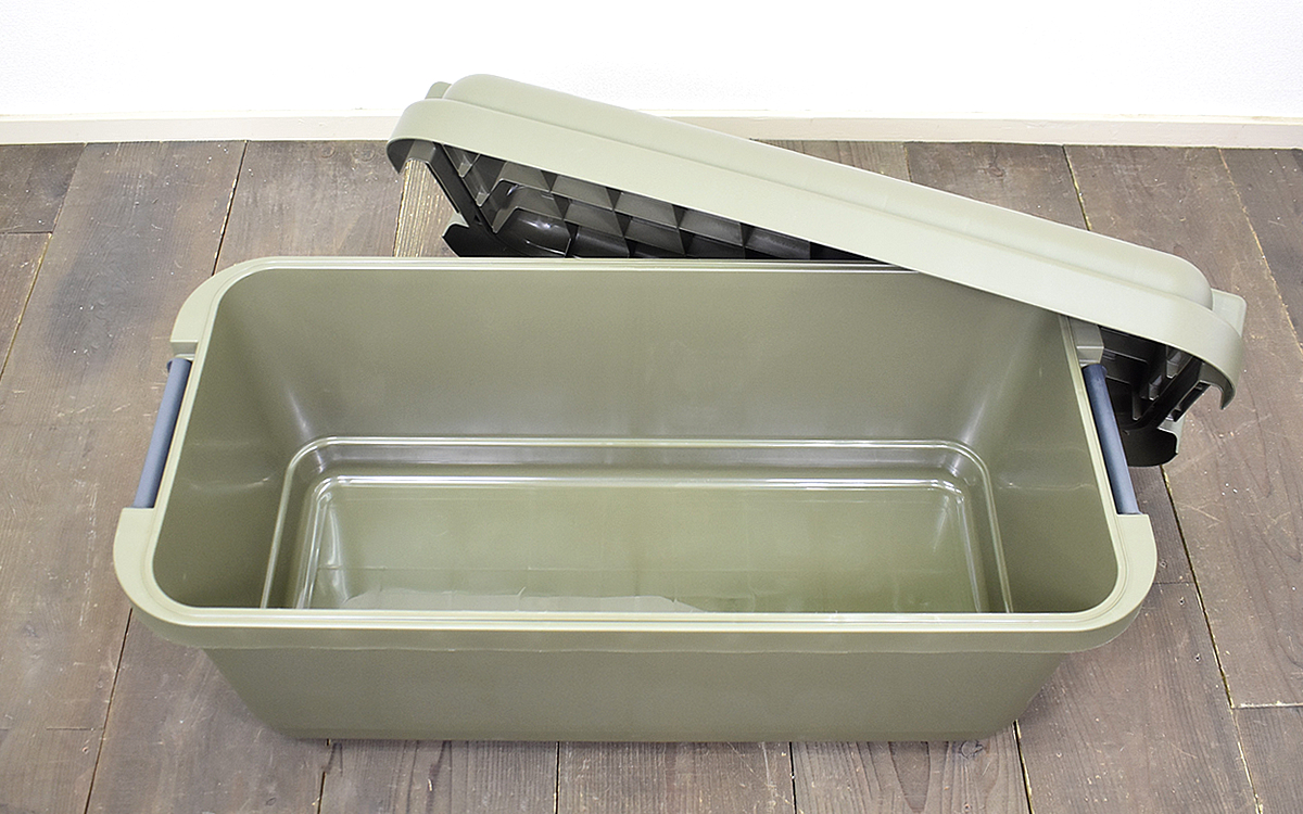 自分で選んだサイズとはいえ、手元に届いた商品の大きさにびっくり。外形寸法は840(幅)×400(奥行)×380mm(高さ)、容量73Lを誇るトランクボックスです。それだけに質量も約4.1kgとなかなかのもの。ポリプロピレン製で金属パーツは使用しておらず、悪目立ちしないオリーブドラブのカラーリングが落ち着いた雰囲気を醸し出しています。