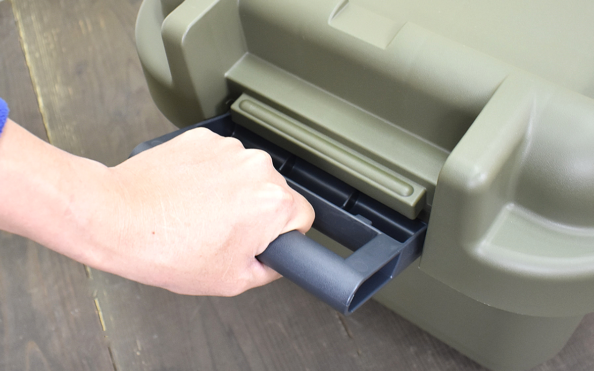 ビッグサイズのトランクボックスですがフタの開け閉めに特別な操作はなく、ロックの際は持ち手のつけ根にあるツメがフタ側の溝と噛み合えばOK。単純でありながら思いのほかしっかりロックされるので、ものが強くぶつからない限りロックが簡単に外れてしまう心配はありません。