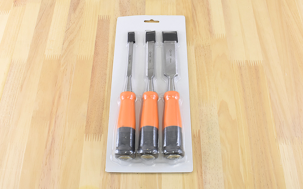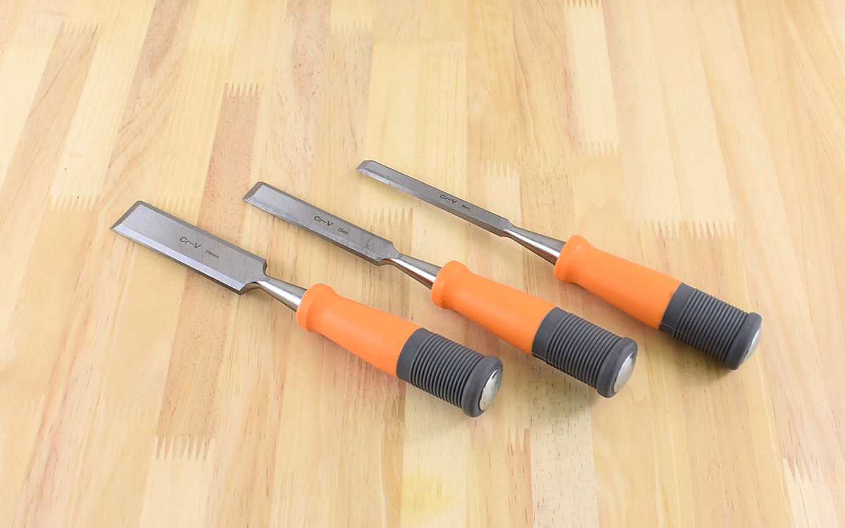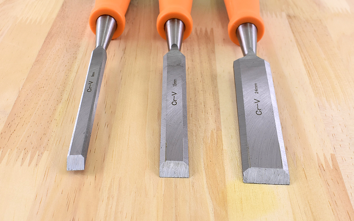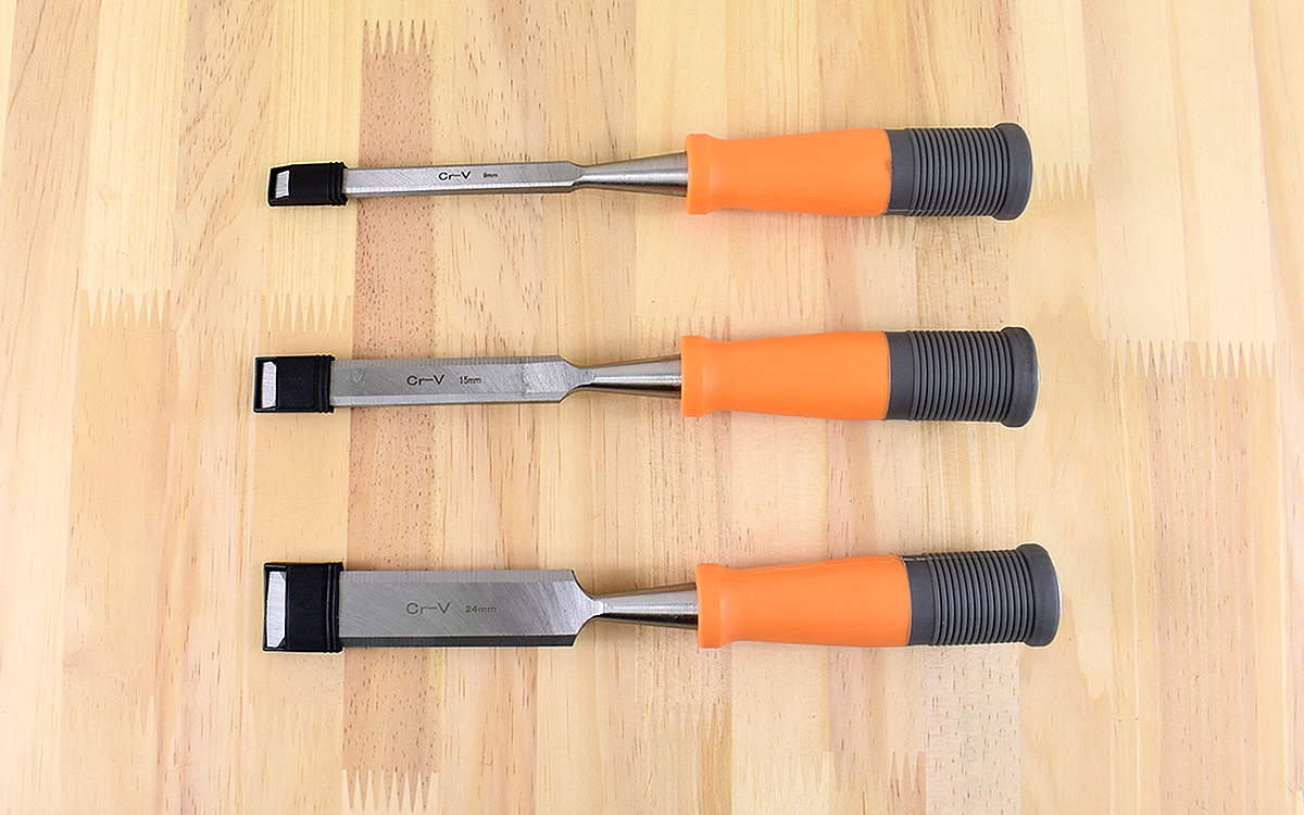 同商品は、サイズの違う3種類の木工用のみが1セットになっています。それぞれの刃幅は上から約9㎜、15㎜、24㎜で、全長はどれも約248㎜。刃の平面部分には小さく刃幅が刻まれているので、サイズも一目で確認できます。刃先には、刃幅にあった黒い保護キャップもついているので安心。