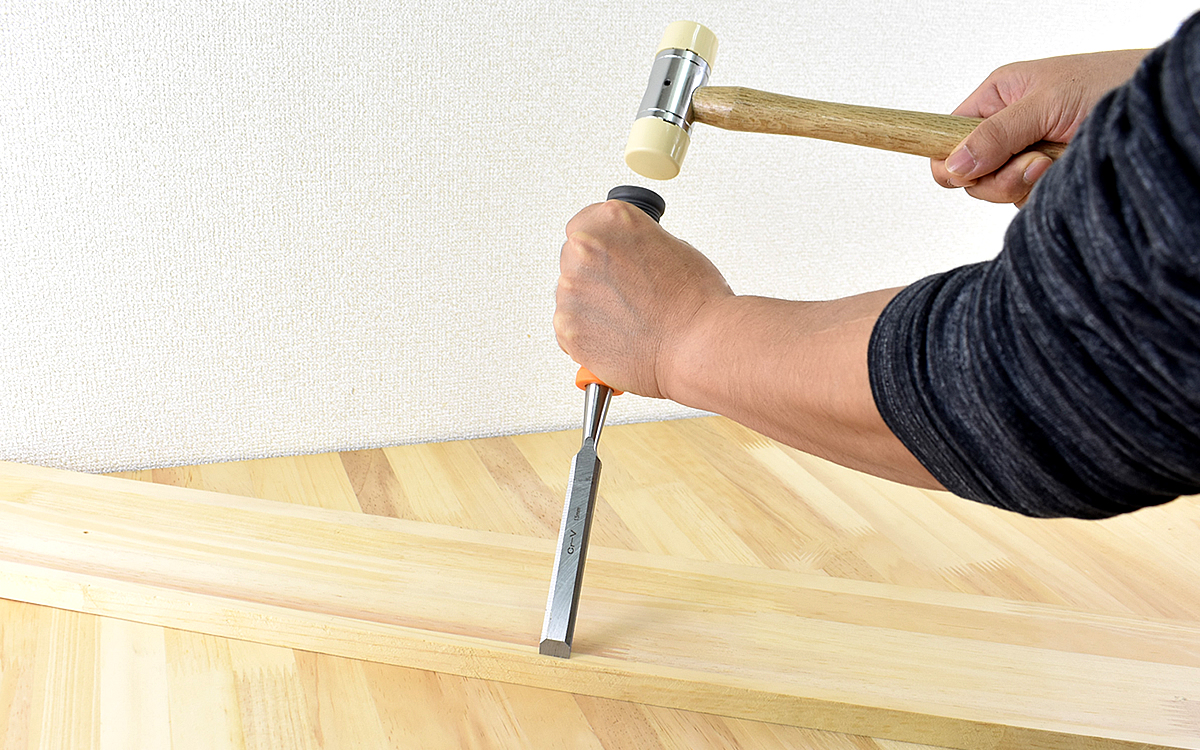 気になる切れ味を確かめるため、実際に同商品を使って木材を削ってみました。このように刃を木材に当てながら、グリップの鉄製になっている底面をハンマーで叩いて刃を進めていきます。15㎜ののみを使って木材の角を削ってみたところ、軽く叩いただけで刃が木材に入り始めてすぐに角を落とすことができました。切れ味も抜群です。