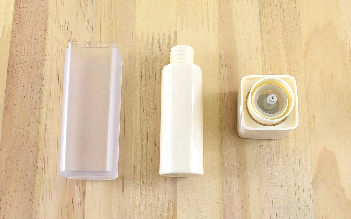 二層構造になっているので、割れてこぼれてしまう心配がないので安心。やっぱり一番のポイントは、アイボリーカラーとマットな半透明の質感の組み合わせが最高にオシャレなところ。透明カバーとボトルには隙間があるので、お気に入りのイラストなどを入れてオリジナルのボトルにするのもオススメです。