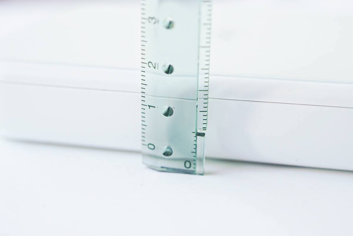 また定規の目盛りは、外側の30cmだけでなく内側にもあり、奥行きや高さを測る際に使用できます。商品サンプルや小箱の高さなど意外に使うこの目盛りが便利なんです。
