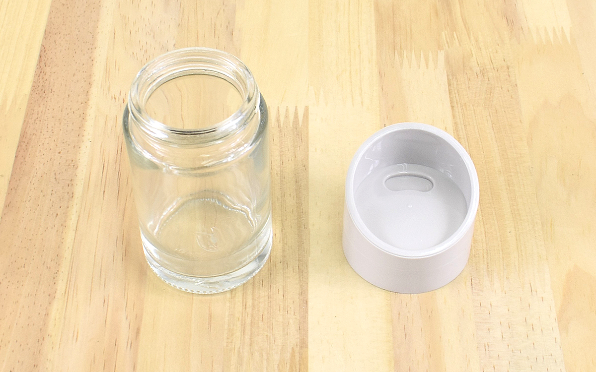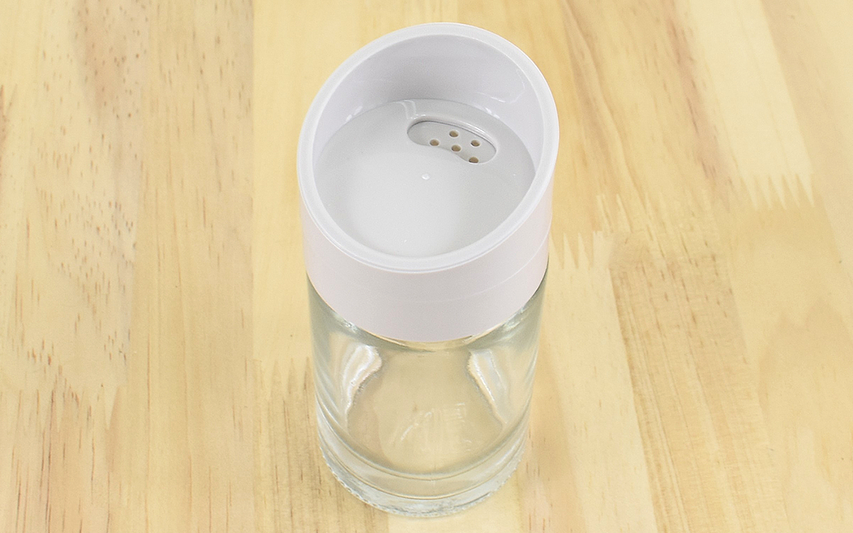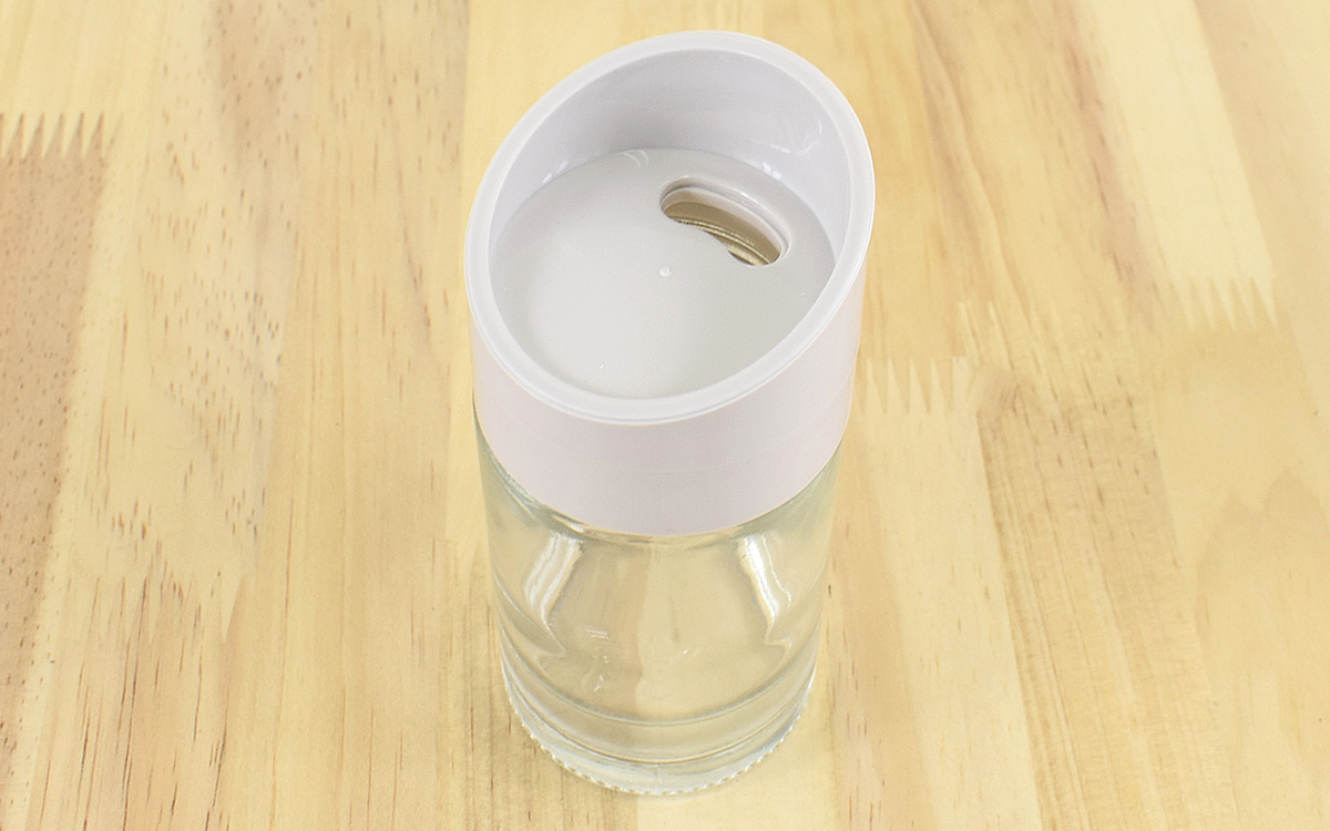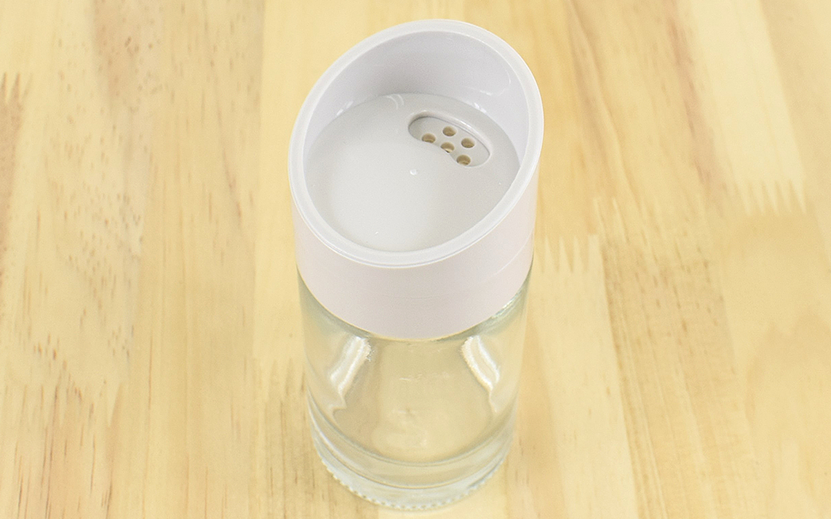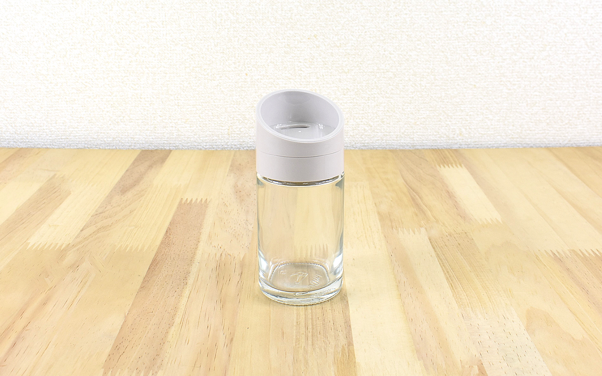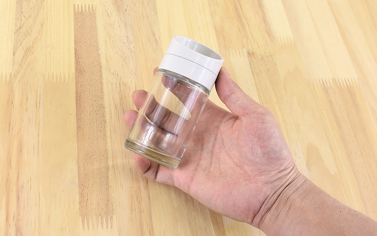 調味料を入れるときは、ガラス瓶から蓋を外すだけのいたって簡単な作り。サイズは約11.8(縦)×5cm(直径)で、容量は約100mlほど。塩やスパイスを入れるのにちょうどいいサイズですね。
