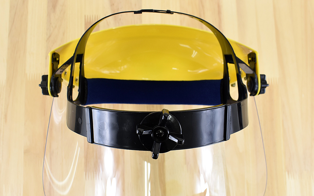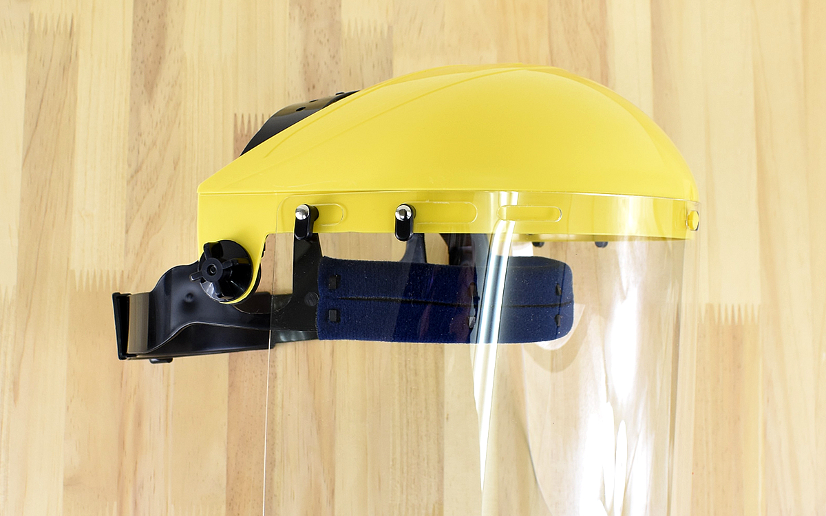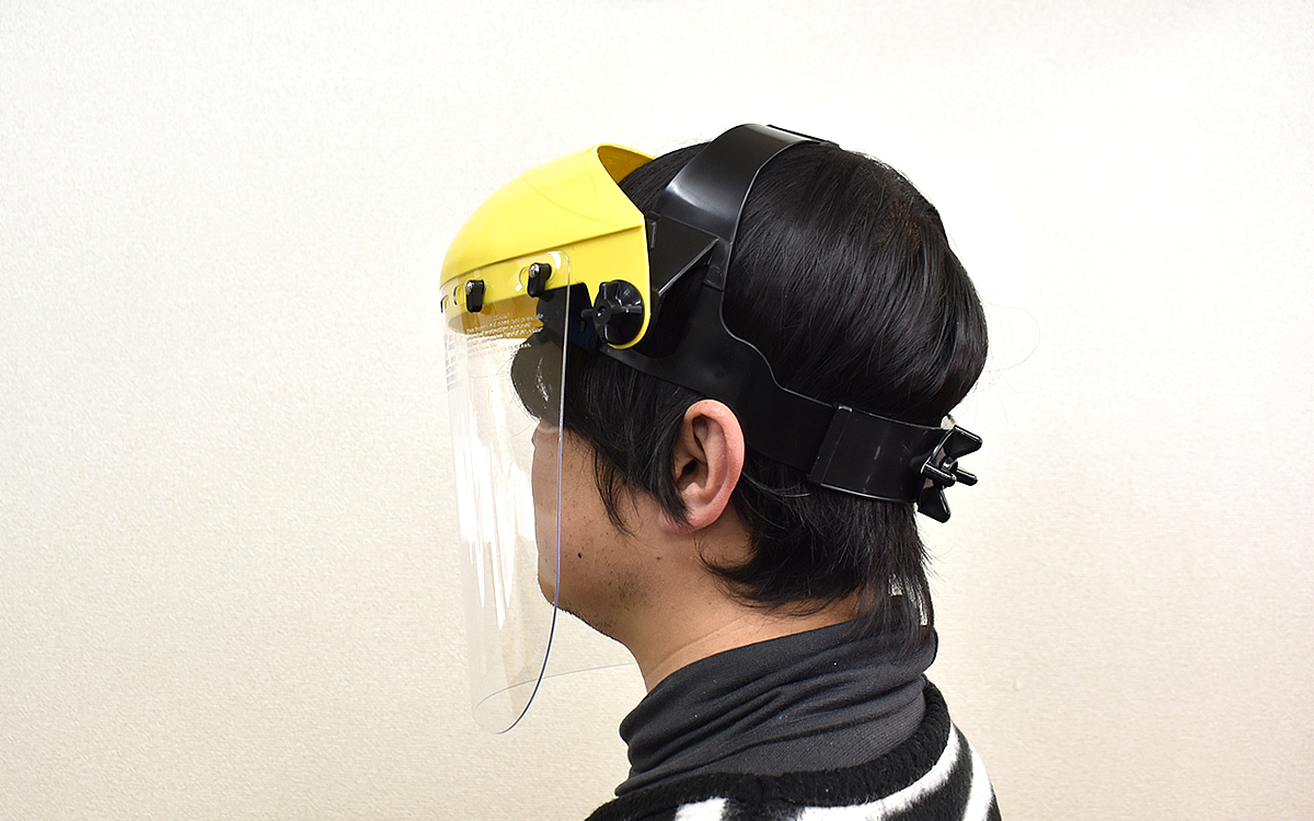 かぶった後にダイヤルを回して微調整もできるので、マジックテープやベルトのようにゆるむこともなく頭にしっかりフィットしてくれます。額部分にはスポンジ素材があしらわれており、長時間作業していても痛くならなそう。シールドの高さは約185mmあるので顔をしっかり覆ってくれました。