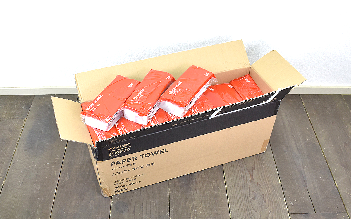 手洗い場や洗面台などで重宝する衛生的な使い捨てのペーパータオル。とはいえ中には薄くて使いにくいタイプや、毎回捨てるのにはコスパが悪いものもありますよね。よく使うものだからこそ良い商品を選びたいと思い、今回は「ペーパータオル 厚手タイプ」(5379円/税込)を箱買いしてみました。