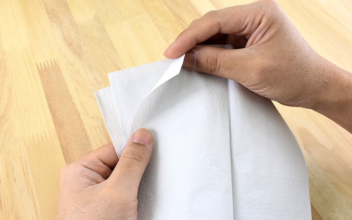 材質は再生紙で、見た目ではわかりにくいですが表面はほんのわずかに凹凸をつけたエンボス状。手に馴染みやすいのがポイントです。厚手タイプというだけあってティッシュペーパーに比べて強度があり、軽く引っ張った程度では破れませんでした。