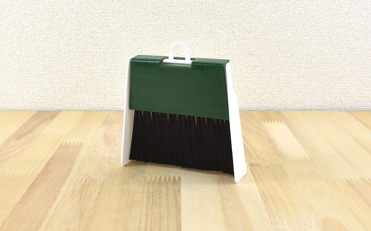 掃除が終わったあとは、立たせてデスク上に置いておきましょう。ちりとりの左右の縁は3.5cmほどあるので、自立させても安定しています。ちりとりのループを活用してフックに引っ掛けられるのもGOOD。ほうきはちりとりのループ部分に通っているので、ぽろりと落ちてしまう心配はありません。
