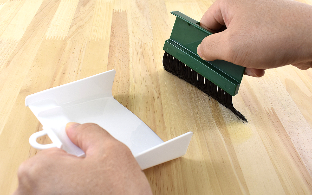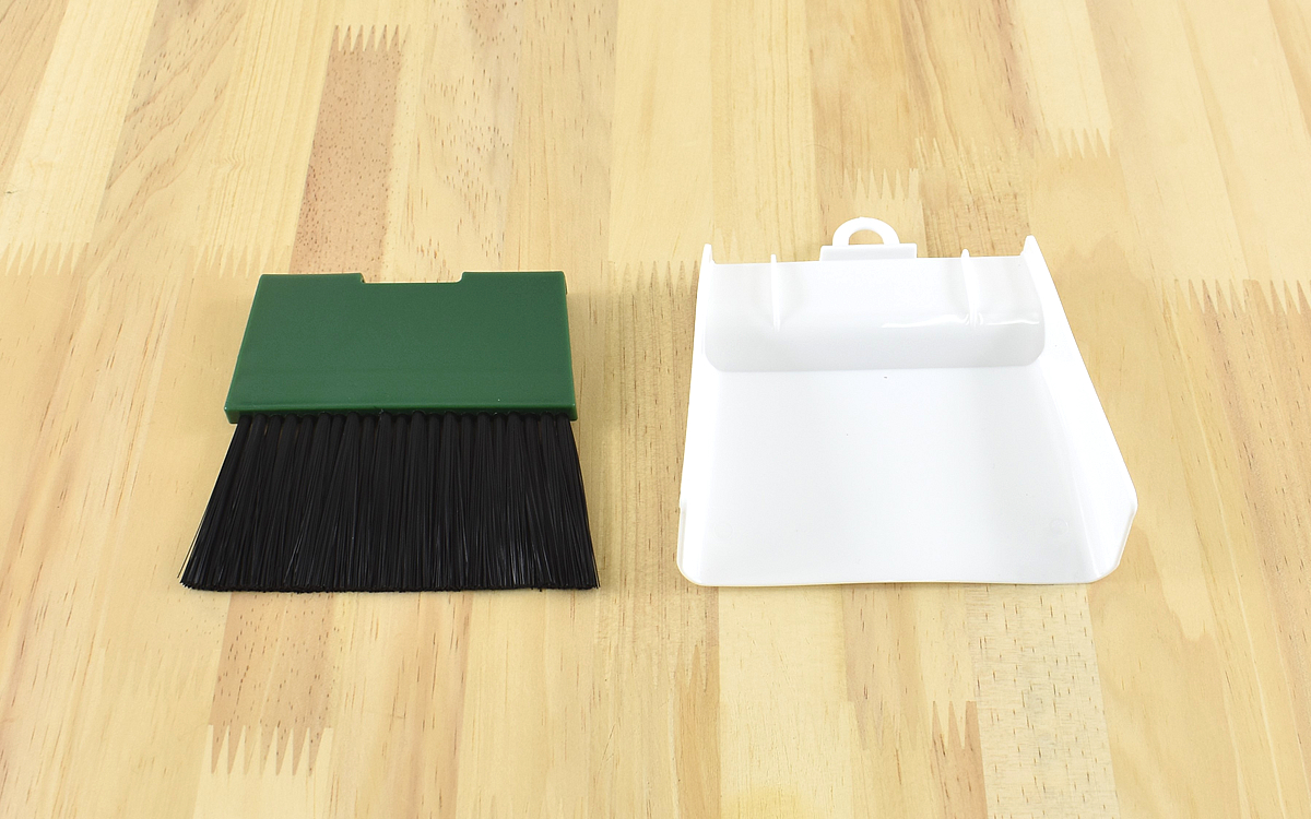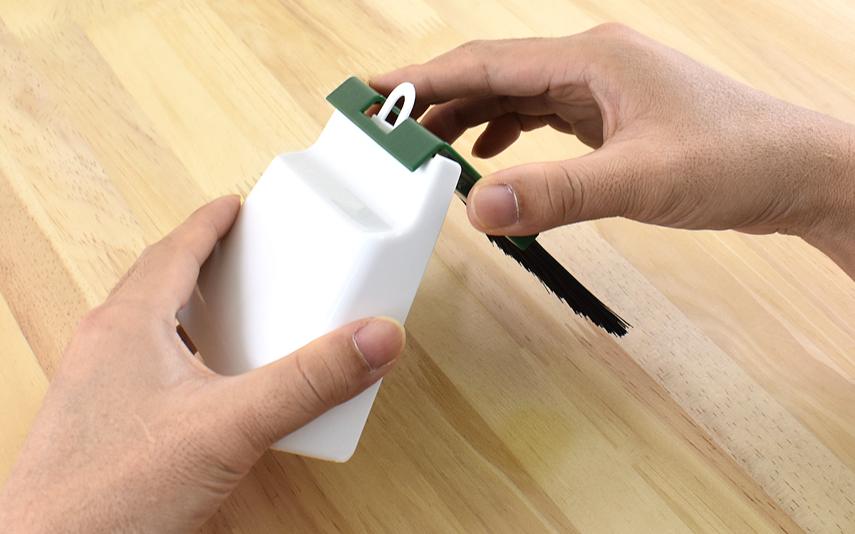 もちろん使い方は従来のほうきやちりとりと同じ。まずはちりとりのループ部分に引っ掛けてあるほうきを取り外します。掃除をするときには、ちりとりを横に倒してほうきで掃くだけ。ほうきの穂が開いていなければ、ちりとりの開口部にすっぽり収まります。超ミニサイズですが、意外とスムーズにほこりをちりとりに入れることができました。