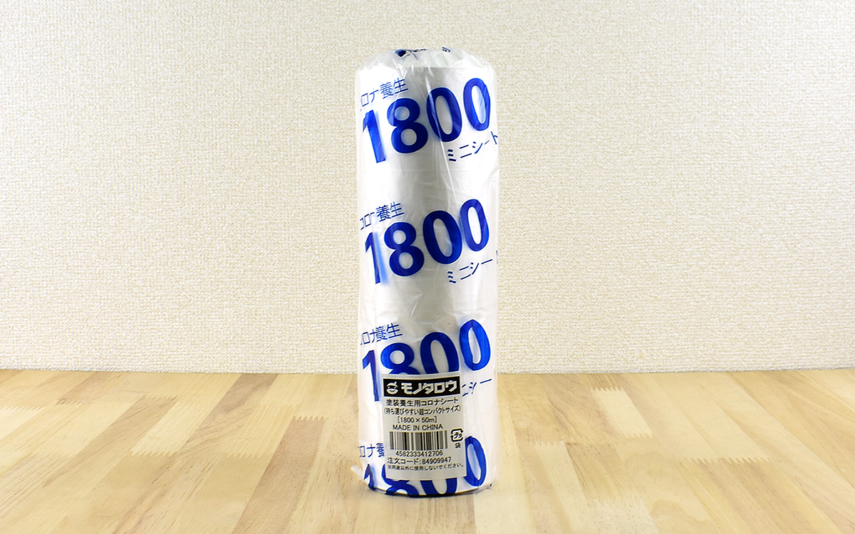 手元に届いた商品は筒形のビニールに包装されていて、ビニールには大きく「1800」の表記が。数字はシート幅の1800mmを示していて、他に3600mmタイプのシートを選択することもできます。シート幅だけでなく長さや価格も変動するので、必要になるサイズのチェックをお忘れなく。
