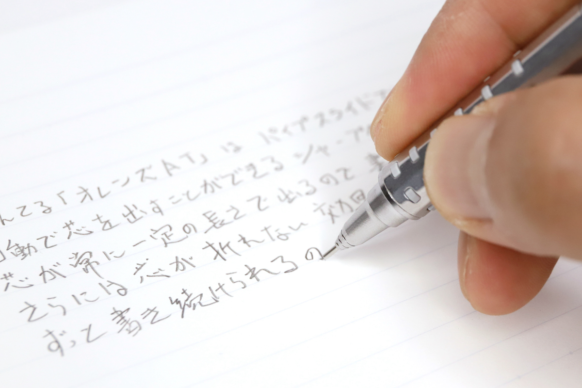 このスルスル軽く書けるなめらかなAin芯と、止まらず書き続けられる自動芯出しのオレンズATは、かなりの好相性。なにより、メーカーもシャープペンシルの動作確認や耐久チェックは自社の芯で行っているわけで、製品本来の性能をフルに味わいたいのであれば、やはりメーカー純正芯を使うのが正解だろう。