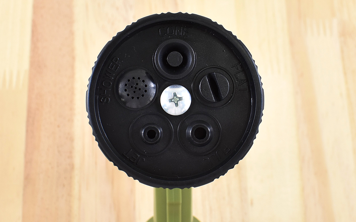 5パターンの水流は、「シャワー」「ストレート」「ジェット」「横拡散」「広拡散」の切り替えが可能。先端を回すとスムーズな動きで切り替えでき、各ポジションにくると「カチッ」と音がなって固定されました。ノズルの先端には噴射タイプが表記されてるので、一目でわかるのも嬉しいですね。