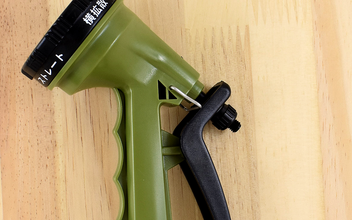 また、水量調節ツマミがトリガーの付け根にあり、ツマミをくるくる回すだけで調節できます。ツマミを反時計回りに回すとトリガーの付け根から離れていき、合わせてトリガーがグリップに近づく仕組み。トリガーとグリップがどれだけ離れているかによって止水弁の開き具合が調整されて出水量を変えられます。