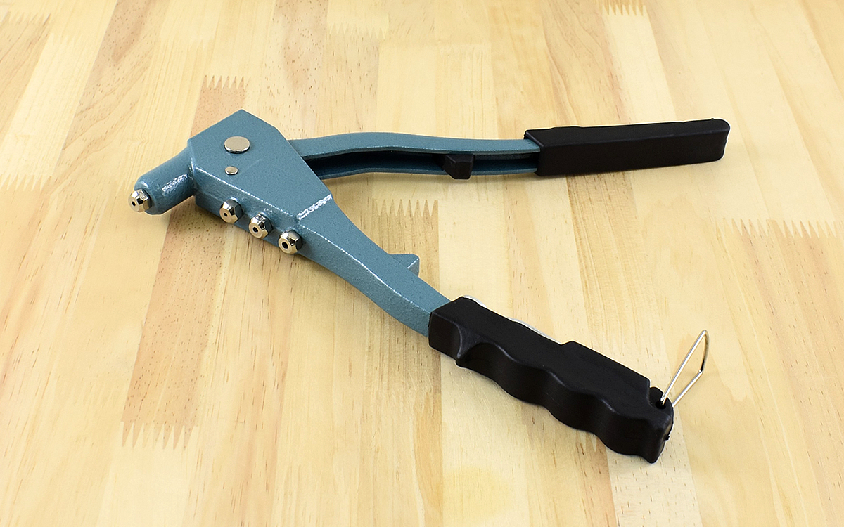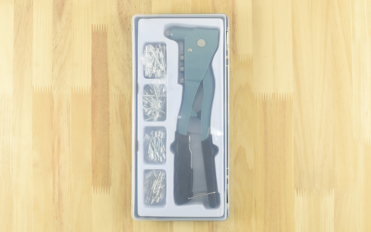 ハンドリベッターと使用頻度の高いブラインドリベットがセットになっている同商品。全長は約260mmです。ブラインドリベットとは片側からのみ締結できるネジのような部品のこと。2.4、3.2、4.0、4.8mmの4種類・25本ずつが付属されており、簡易ケースにサイズ別収納ができます。