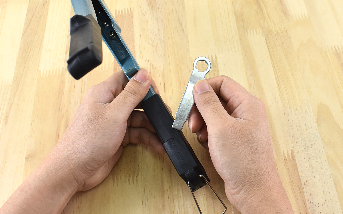ちなみにレンチが収納してあるハンドル末端の銀色フックは、本体を閉じた状態で固定するためのもの。片側のハンドルに引っ掛けてコンパクトに収納できます。