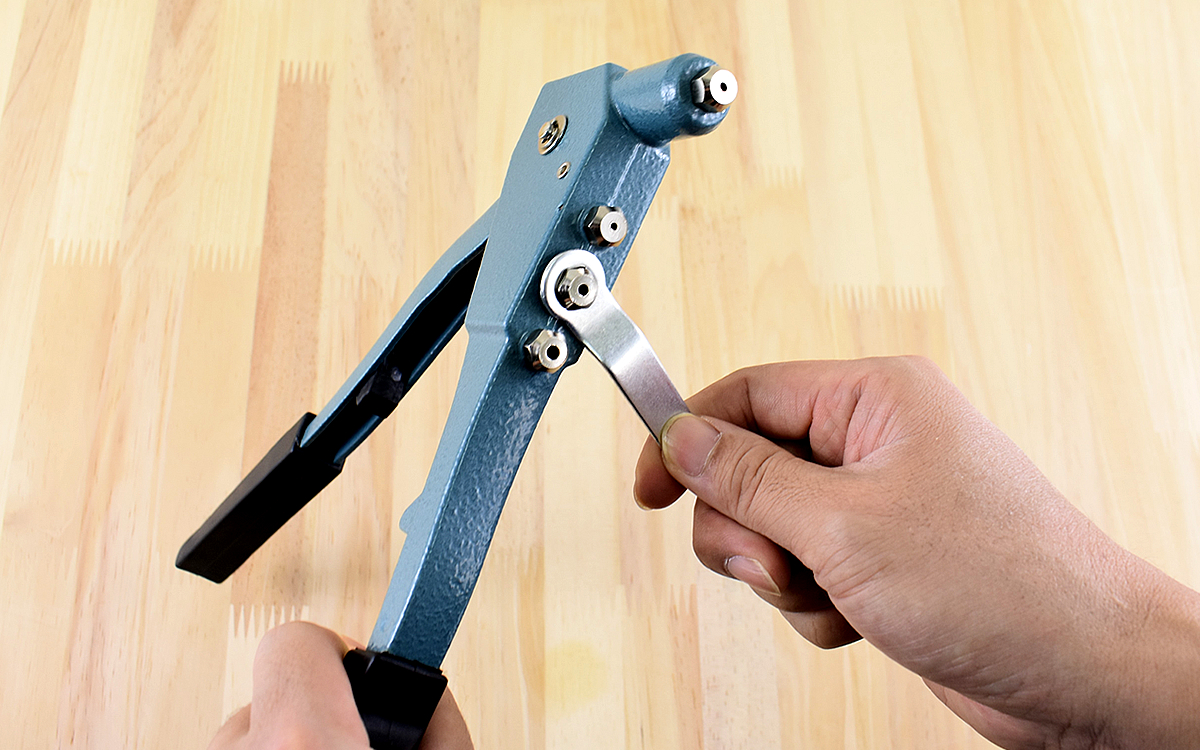 使用時は、まず結合したい部分のリベットサイズを確認します。複数枚の板やアルミを結合する場合はドリルで下穴を開けておきましょう。次に本体上部にあるノーズピースを、使用するリベットサイズに合わせてはめ替えてください。はめ替えの際は持ち手のハンドル部分に収納されている六角レンチを使用します。