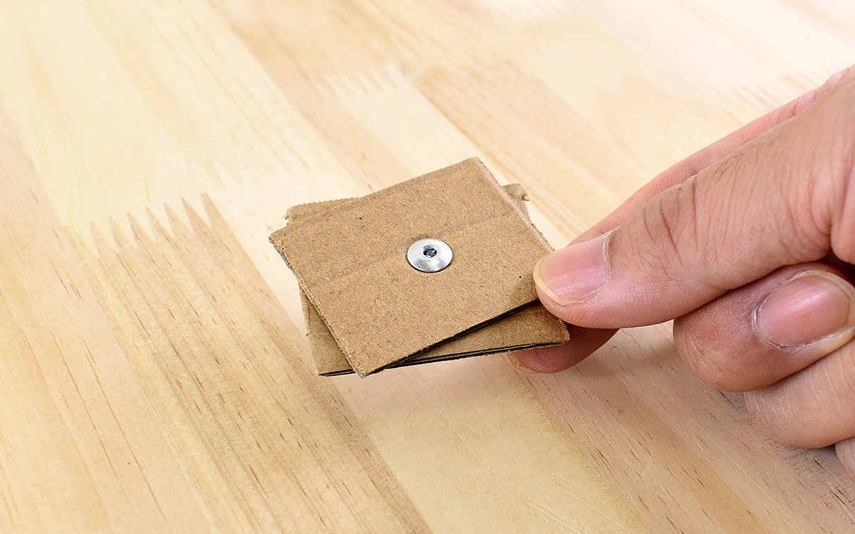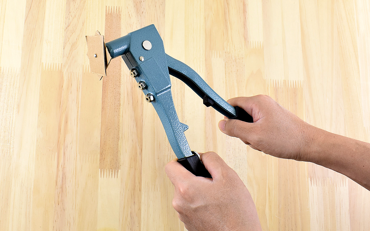 椅子の修繕前にダンボールでテストしてみることにしました。ノーズピースにブラインドリベットをセットしたら、ダンボールの穴に通して一度ハンドルを閉じます。さらにもう一度押し込むと本体側のシャフトが切断されて接合。押し込むときは多少の力が必要ですが、ハンドル部分が黒くコーティングされており手の痛みなどはありません。