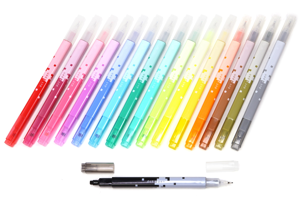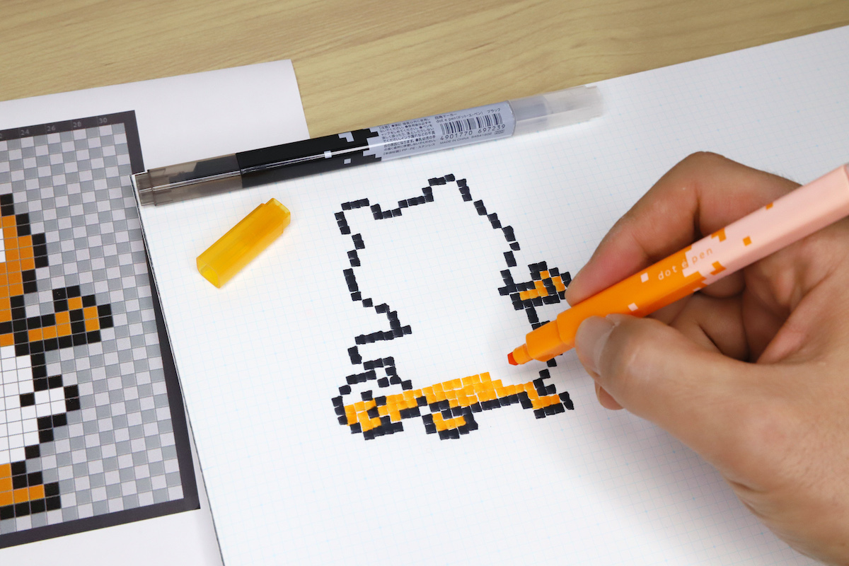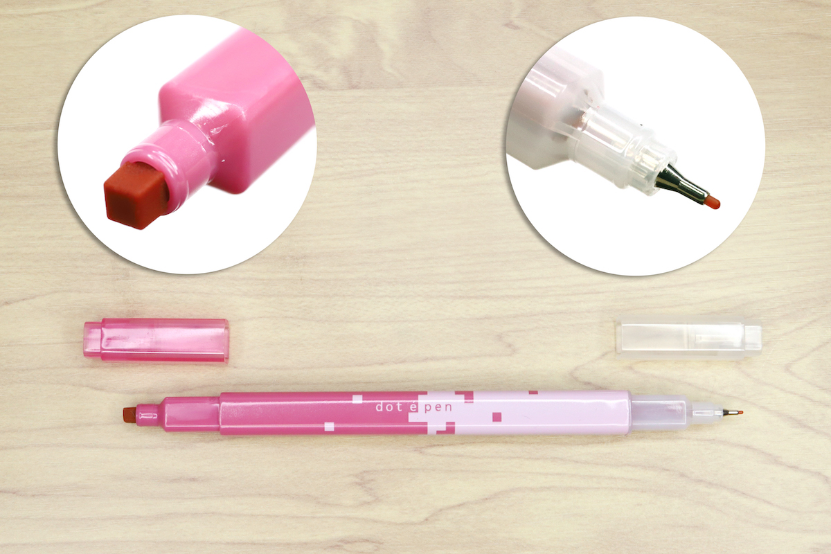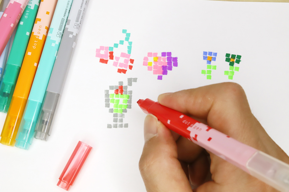 その“専用ツール”というのが、サンスター文具から2022年11月に発売された四角マーカー「dot e pen」(ドット・エ・ペン)だ。四角い軸に四角いキャップという、8bitなドット感を強調するカクカクしたデザインが、とてもキュートである。