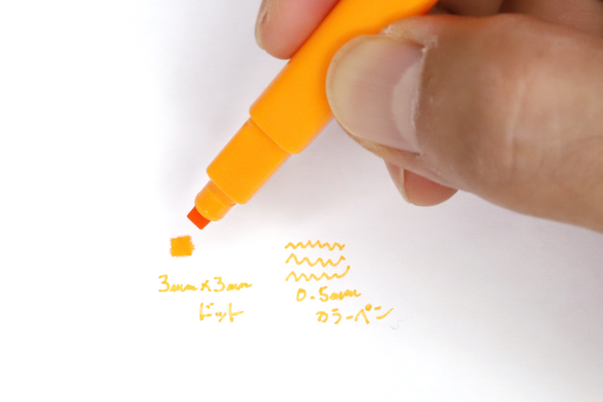 このペンは細芯カラーペンと太芯マーカーのツインタイプなのだが、太芯のチップが四角柱型となっている。で、チップを紙へ垂直に捺すことで四角いドットが量産できる仕組みなのだ。
