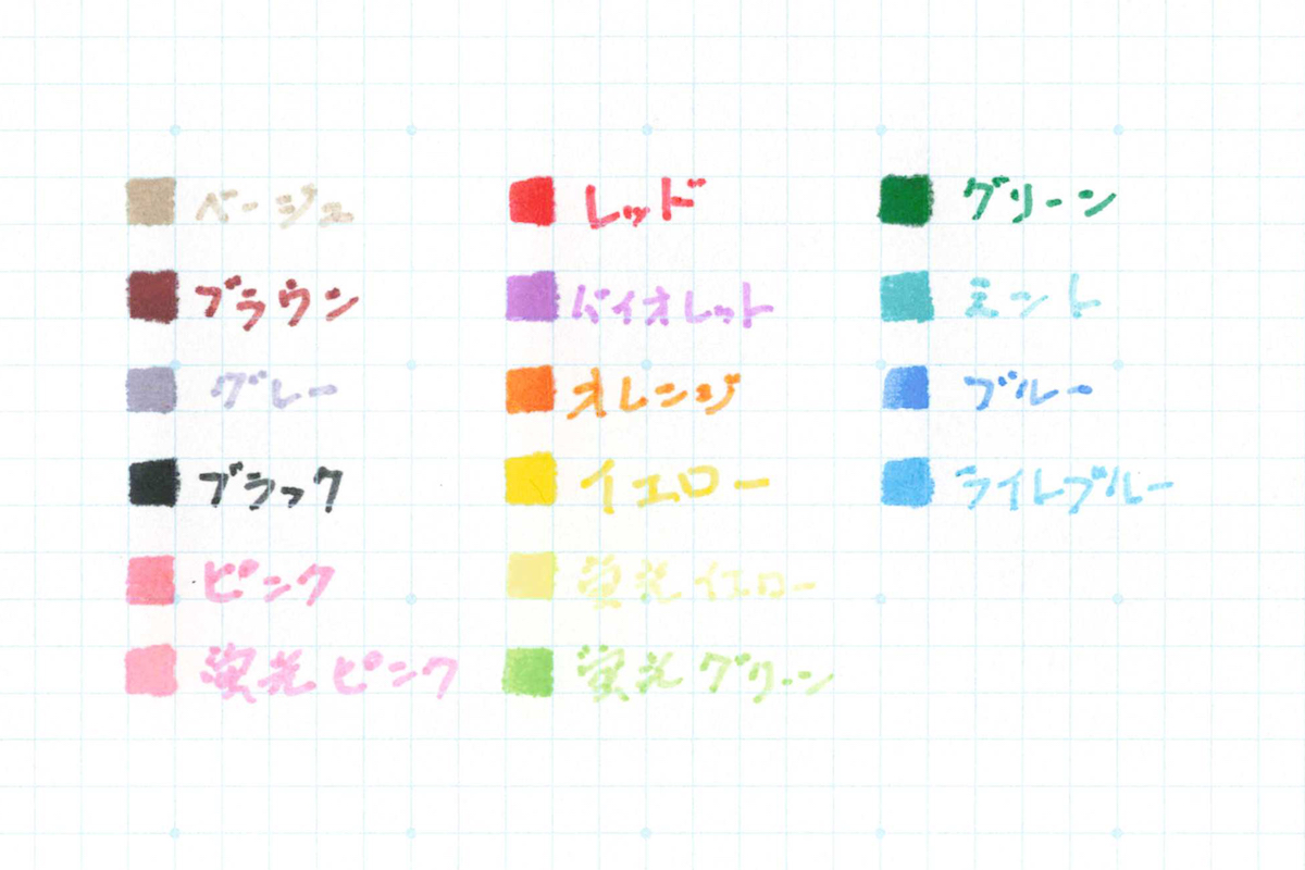 太芯チップは3mm幅のラインも引けるため、0.5mm径のカラーペン+ラインマーカーという使い方もできる。カラーラインアップには蛍光カラーも含まれているため、ノート作りツールとしても充分に役立つはずだ。