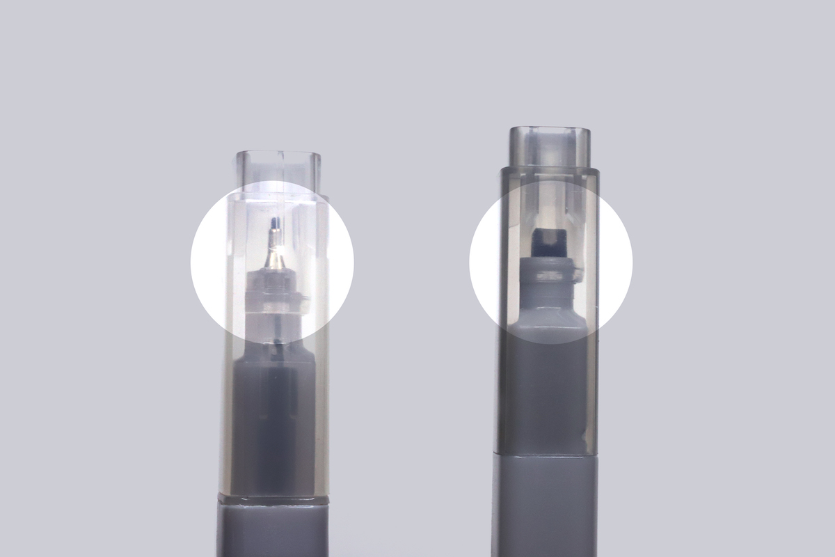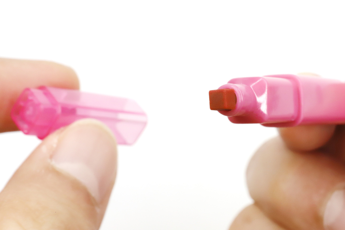 よく見ると、四角柱型の透明キャップの内側に、チップを包むようにもうひとつ円筒形のキャップがあるのが分かるだろう。四角いキャップは円筒キャップと比べると、どうしても歪みやすい。するとフチに隙間ができてしまうため、気密が保てずインクが乾燥してしまうのだ。