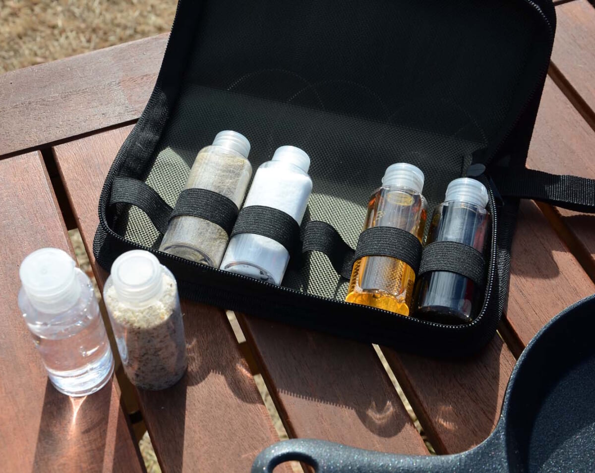 キャンプやBBQ時によく使う調味料を小分けにし、まとめて収納できるポーチ。内部はボトルが独立して収納できる構造で、運搬時にバラバラになる心配もない。ボトルの容量はいずれも50mlで、1〜2回ぶんの調理にピッタリなサイズだ。